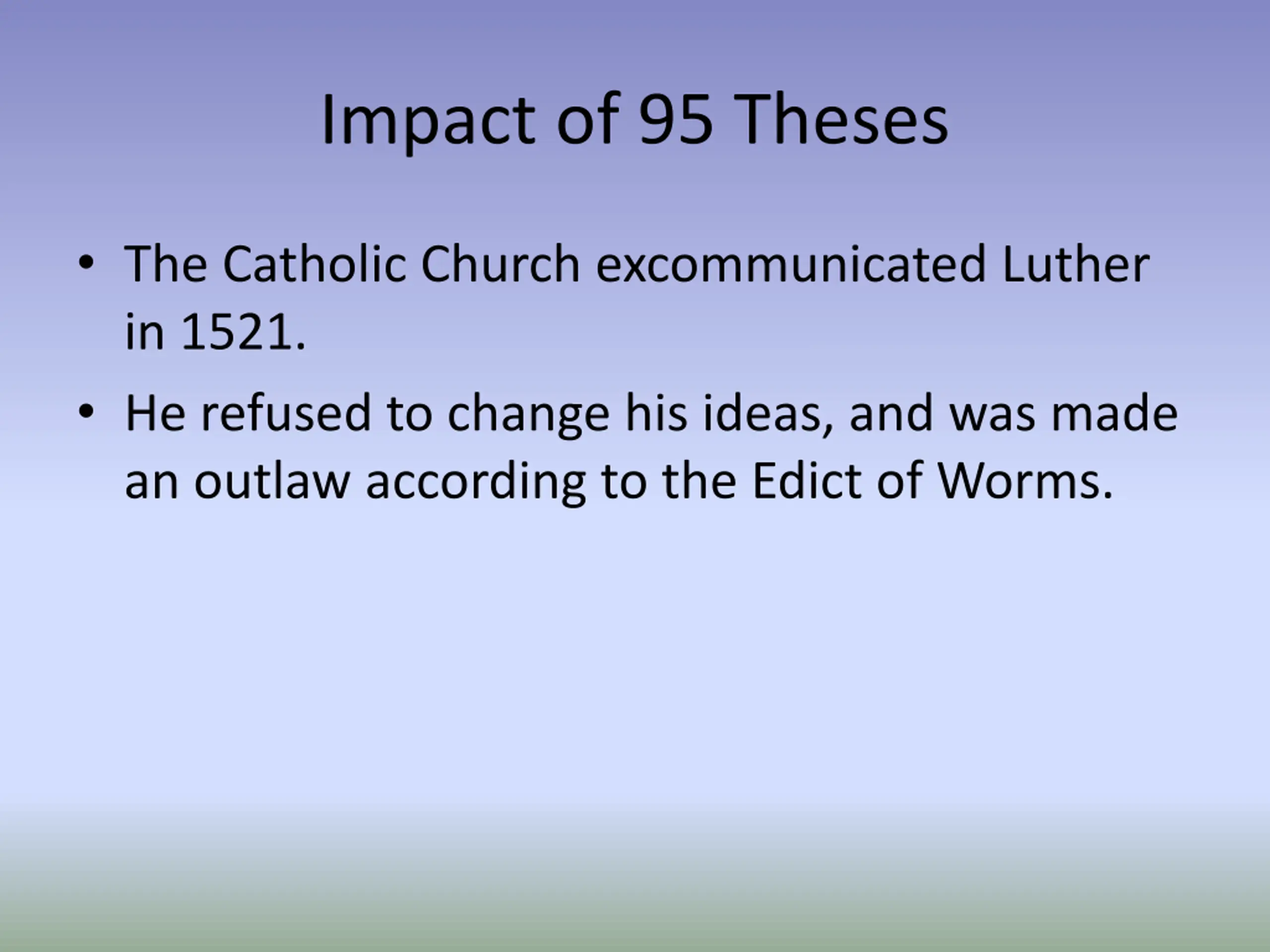 Impact of 95 Theses The Catholic Church excommunicated Luther in 1521. He refused to change his ideas, and was made an outlaw according to the Edict of Worms.