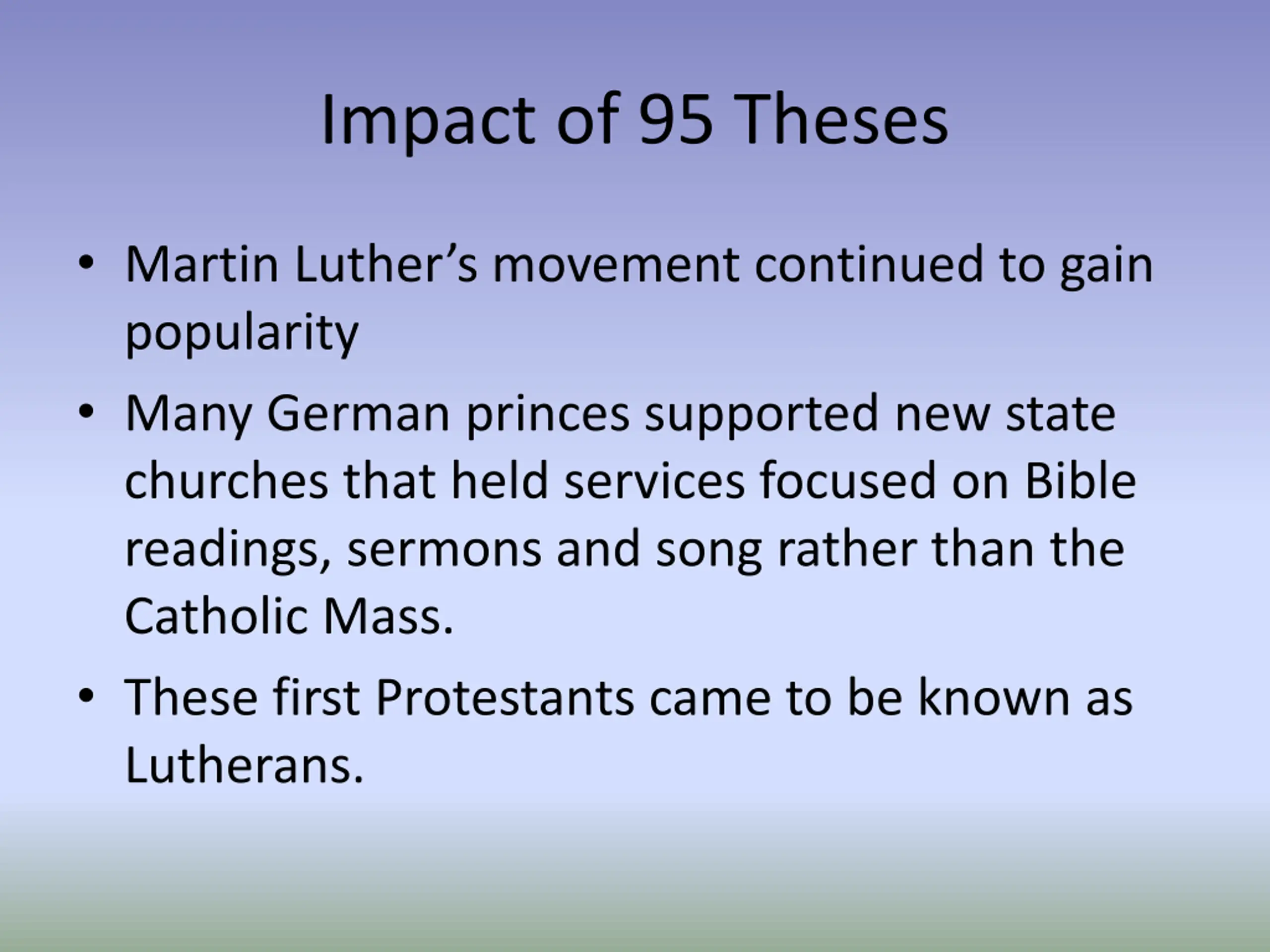 Impact of 95 Theses Martin Luther s movement continued to gain popularity Many German princes supported new state churches that held services focused on Bible readings, sermons and song rather than the Catholic Mass. These first Protestants came to be known as Lutherans.