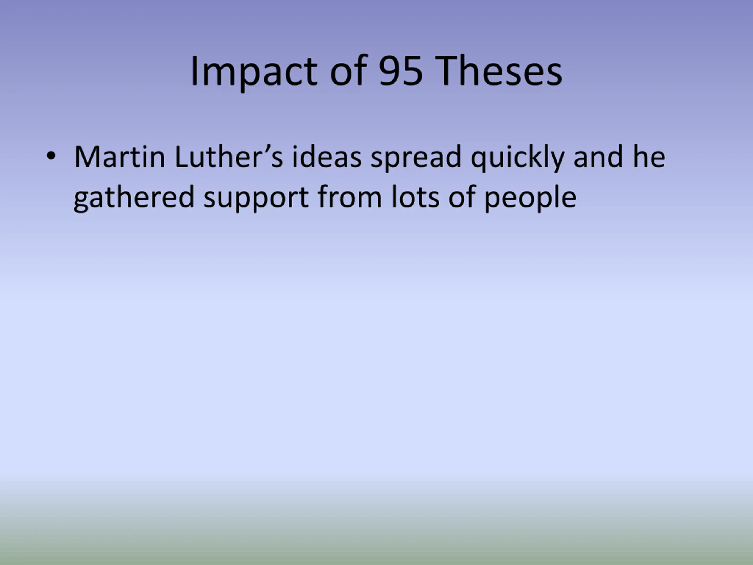 Impact of 95 Theses Martin Luther s ideas spread quickly and he gathered support from lots of people