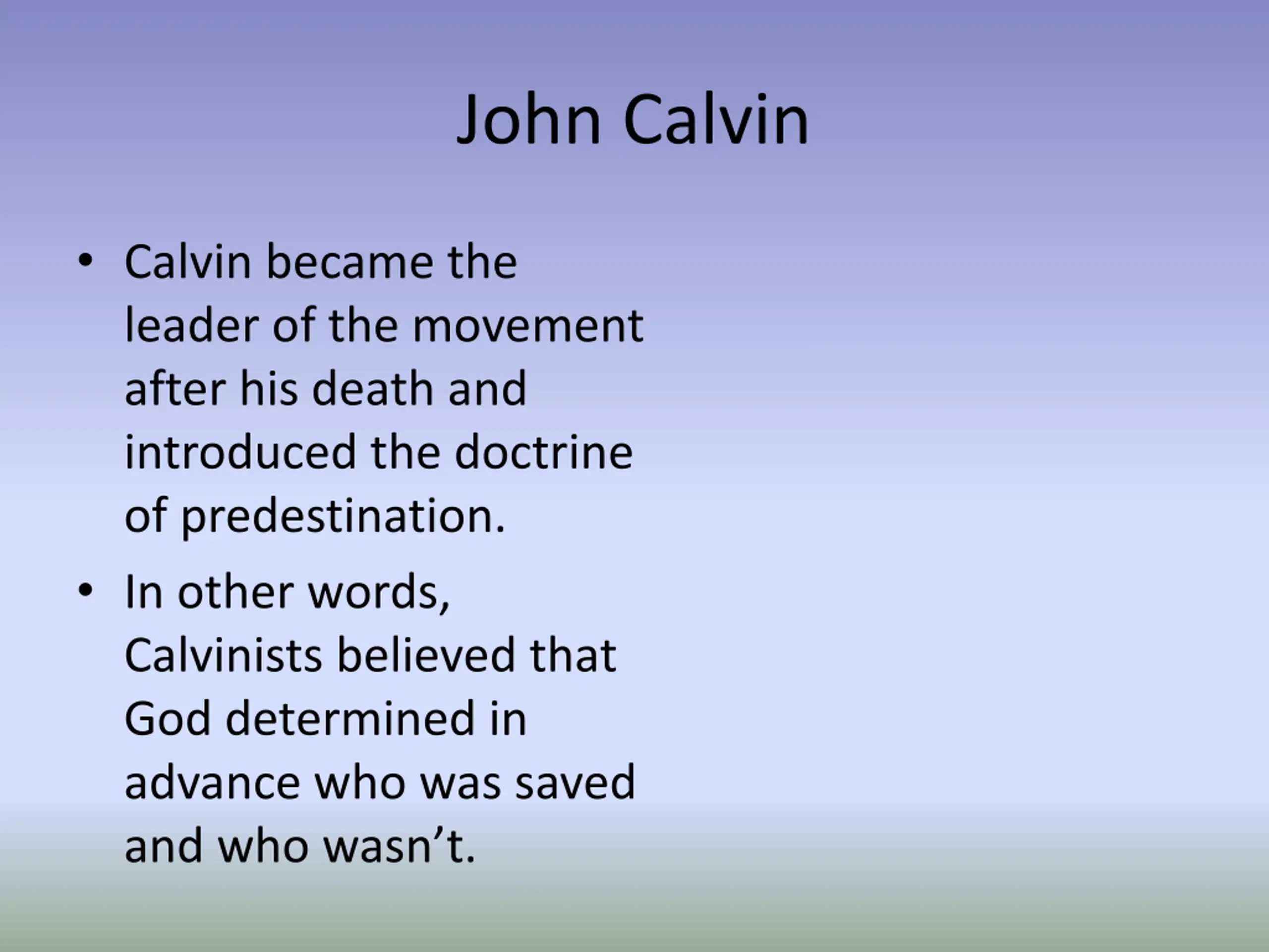 John Calvin Calvin became the leader of the movement after his death and introduced the doctrine of predestination. In other words, Calvinists believed that God determined in advance who was saved and who wasn t.