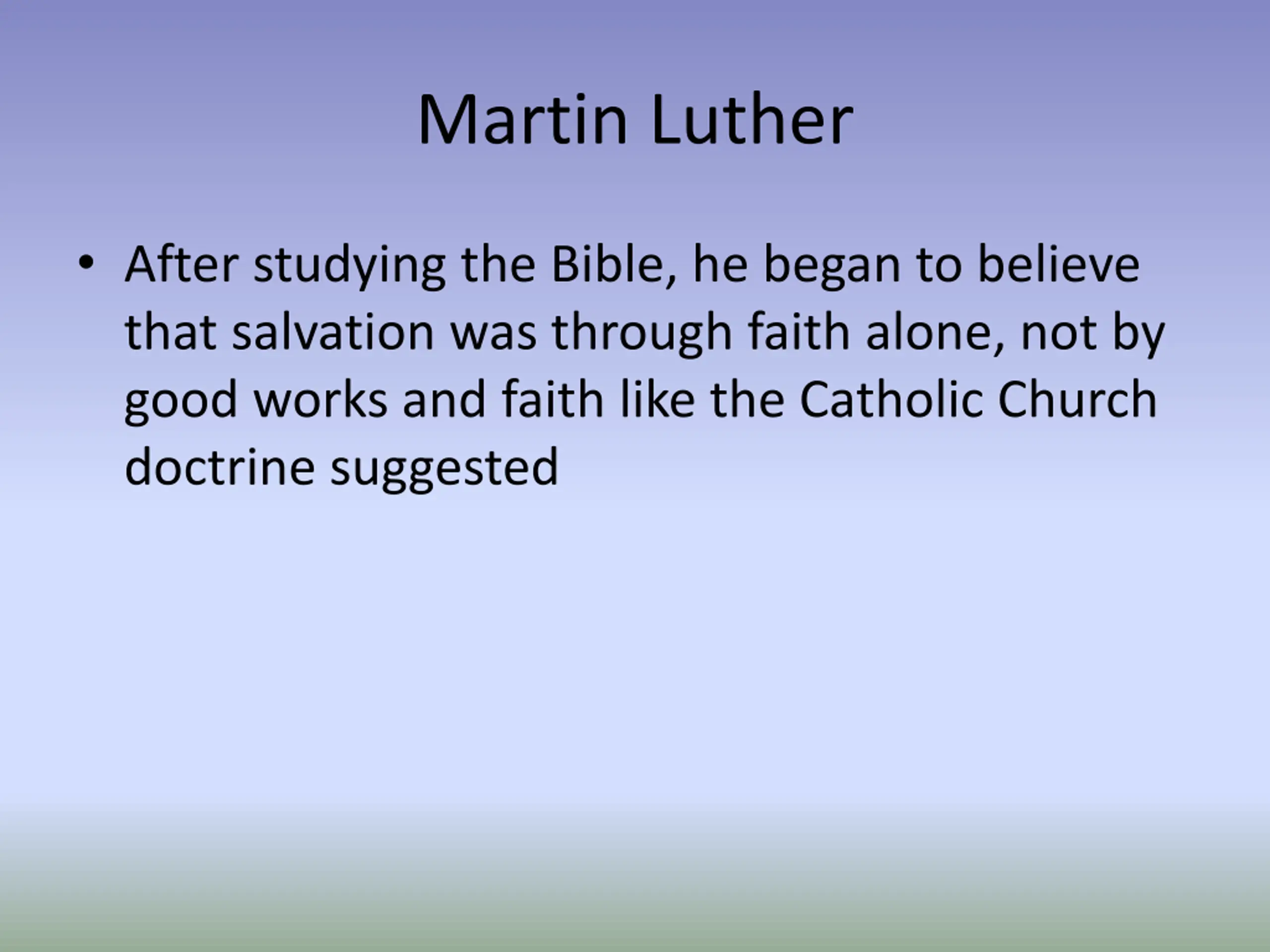 Martin Luther After studying the Bible, he began to believe that salvation was through faith alone, not by good works and faith like the Catholic Church doctrine suggested