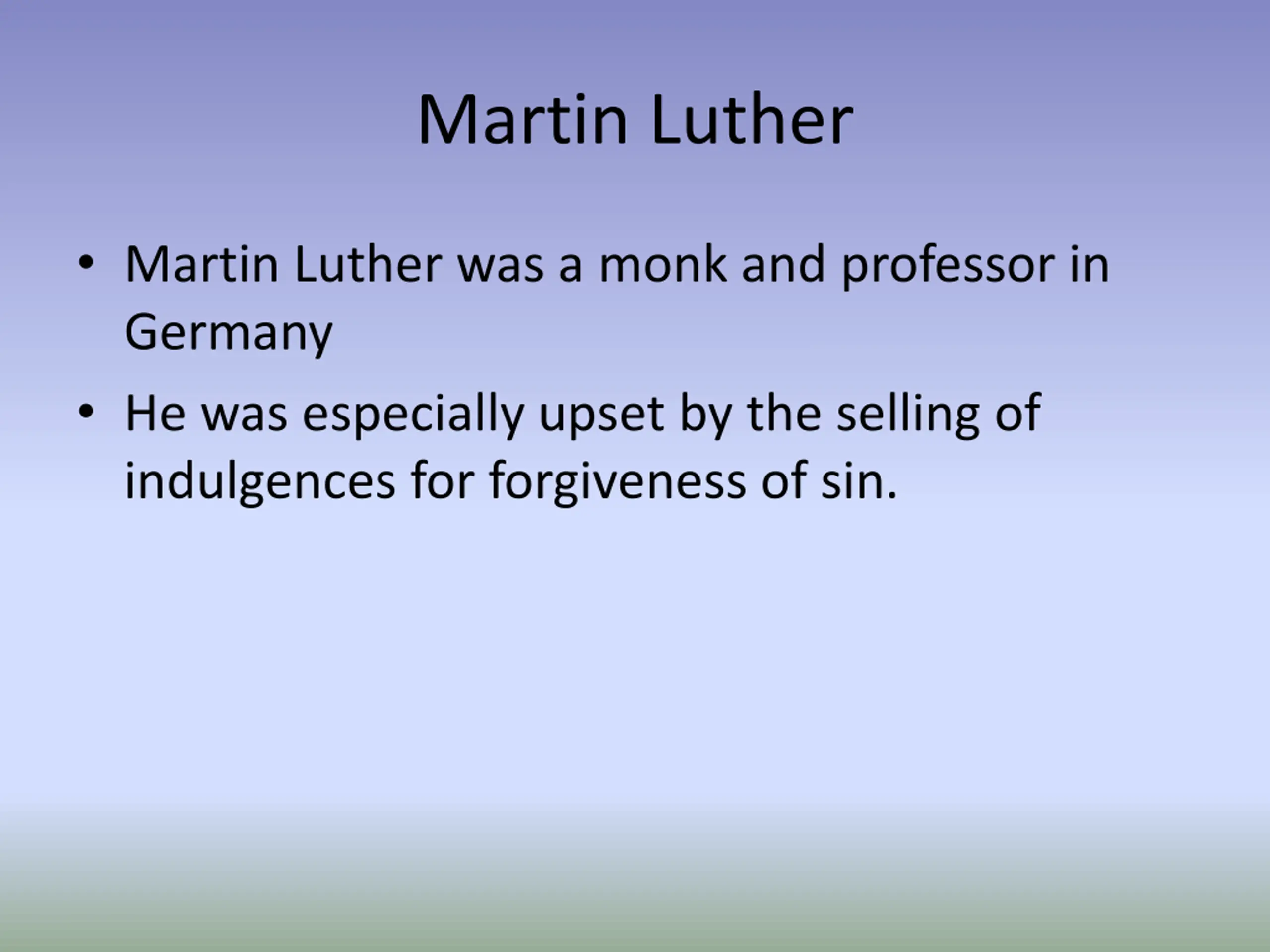 Martin Luther Martin Luther was a monk and professor in Germany He was especially upset by the selling of indulgences for forgiveness of sin.