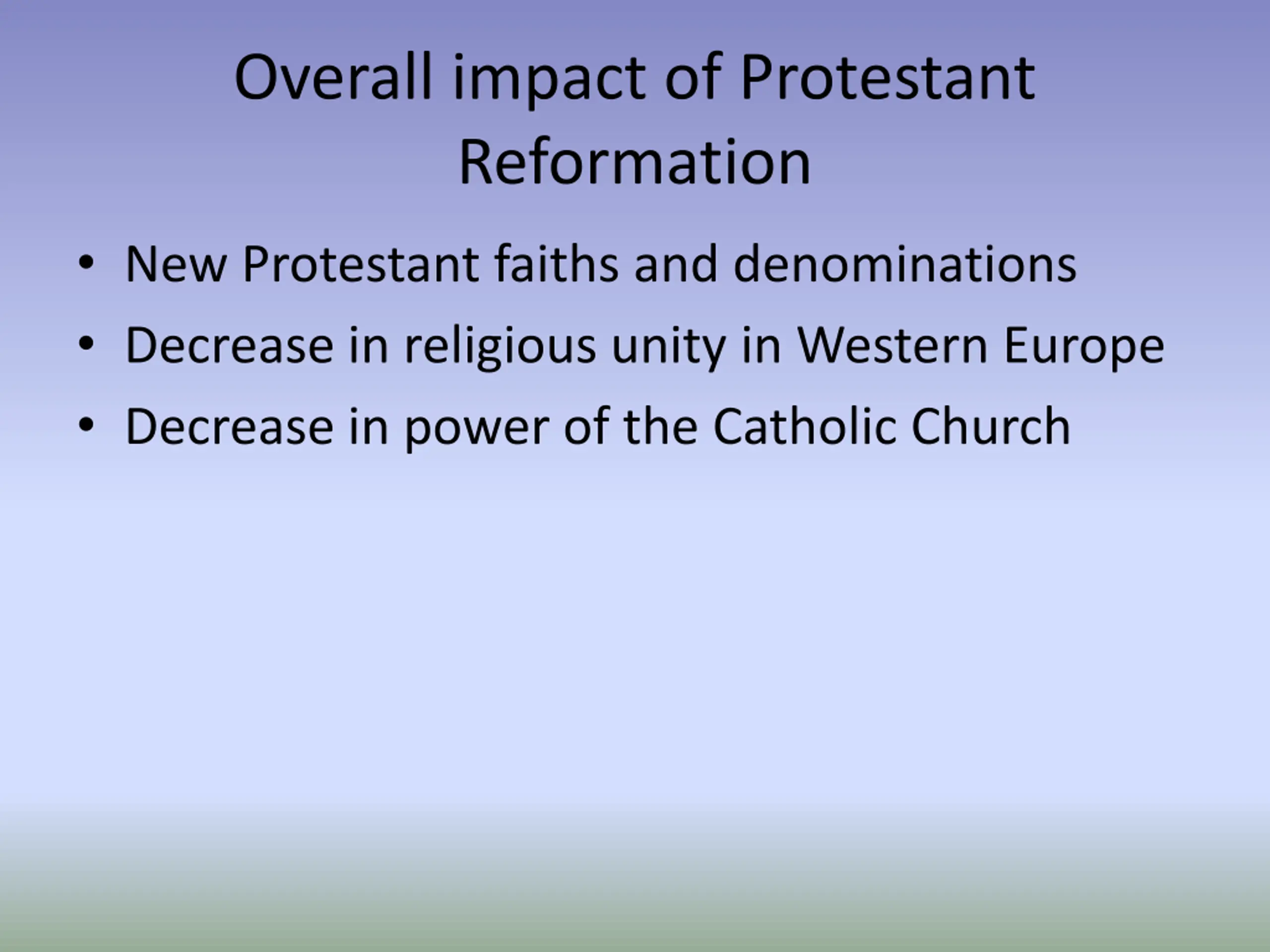 Overall impact of Protestant Reformation New Protestant faiths and denominations Decrease in religious unity in Western Europe Decrease in power of the Catholic Church