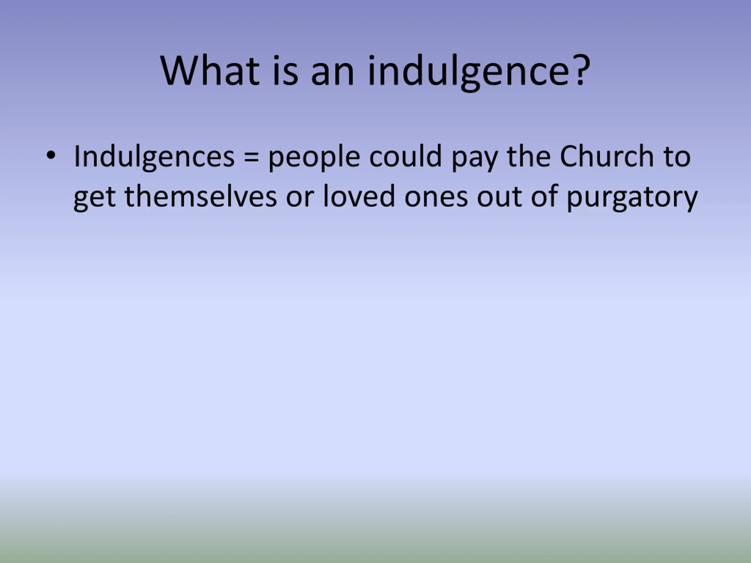 What is an indulgence? Indulgences = people could pay the Church to get themselves or loved ones out of purgatory