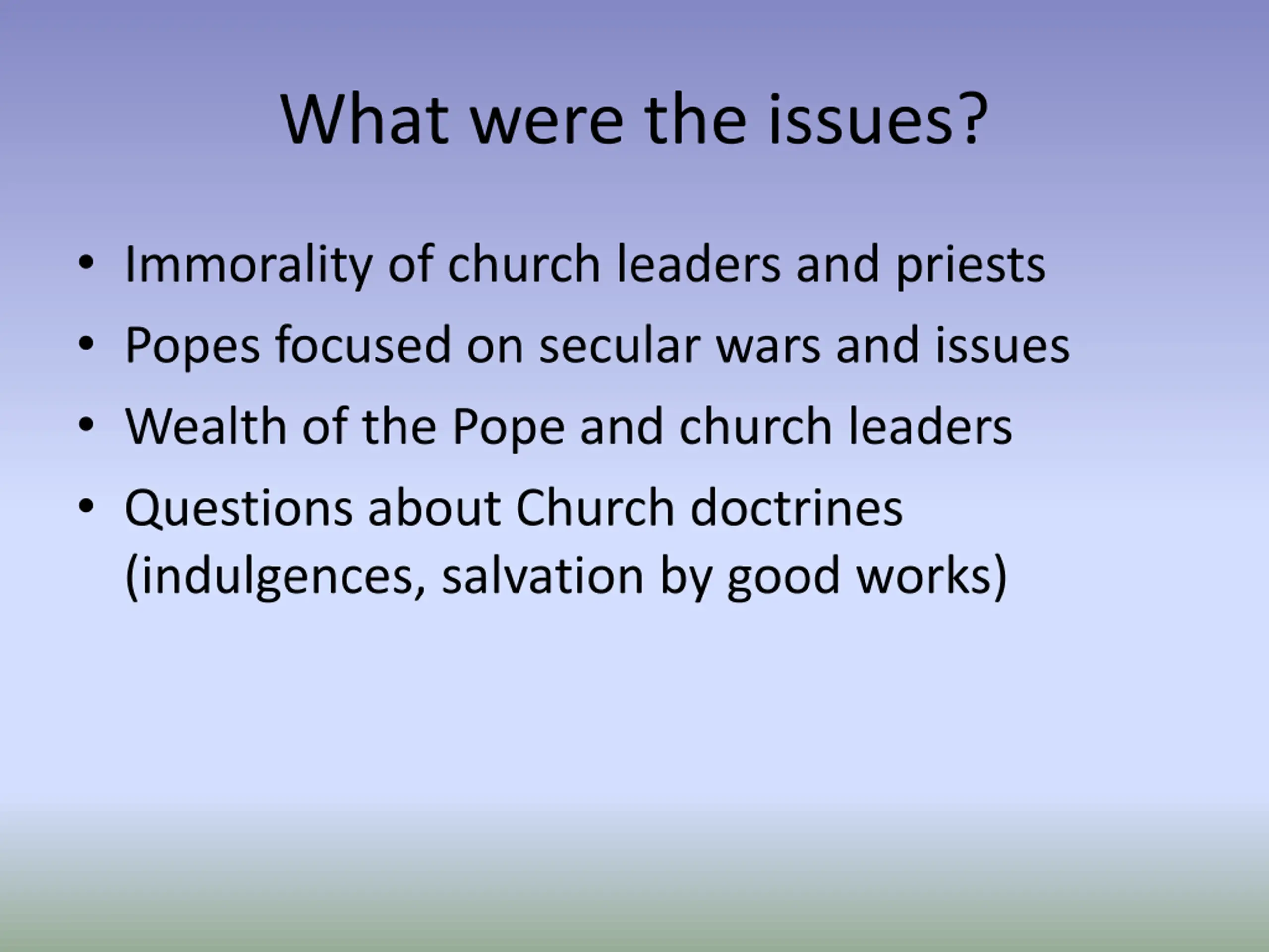 What were the issues? Immorality of church leaders and priests Popes focused on secular wars and issues Wealth of the Pope and church leaders Questions about Church doctrines (indulgences, salvation by good works)