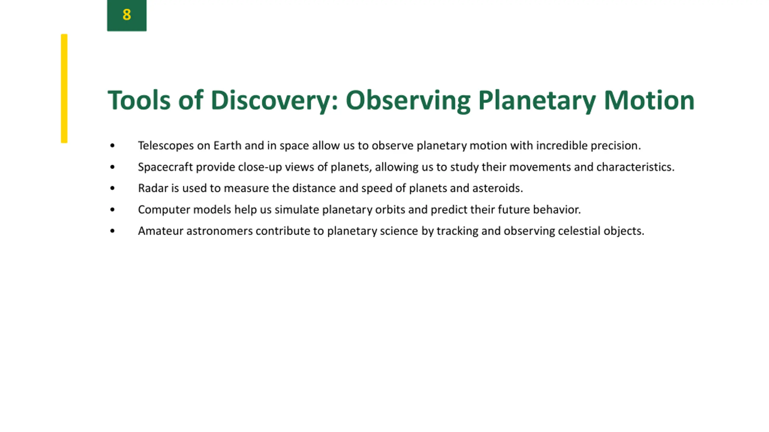 8 Tools of Discovery: Observing Planetary Motion Telescopes on Earth and in space allow us to observe planetarymotion with incredible precision. Spacecraft provide close-up views of planets, allowing us to study their movements and characteristics. Radar is used to measure the distance and speed of planets and asteroids. Computer models help us simulate planetary orbits and predict their future behavior. Amateur astronomers contributeto planetary science by tracking and observing celestial objects.