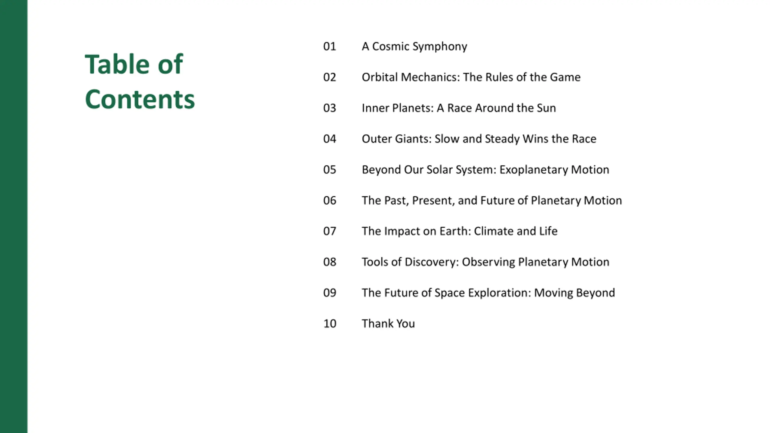 01 A Cosmic Symphony Table of Contents 02 Orbital Mechanics: The Rules of the Game 03 Inner Planets: A Race Around the Sun 04 Outer Giants: Slow and Steady Wins the Race 05 Beyond Our Solar System: Exoplanetary Motion 06 The Past, Present, and Future of Planetary Motion 07 The Impact on Earth: Climate and Life 08 Tools of Discovery: Observing Planetary Motion 09 The Future of Space Exploration: Moving Beyond 10 Thank You