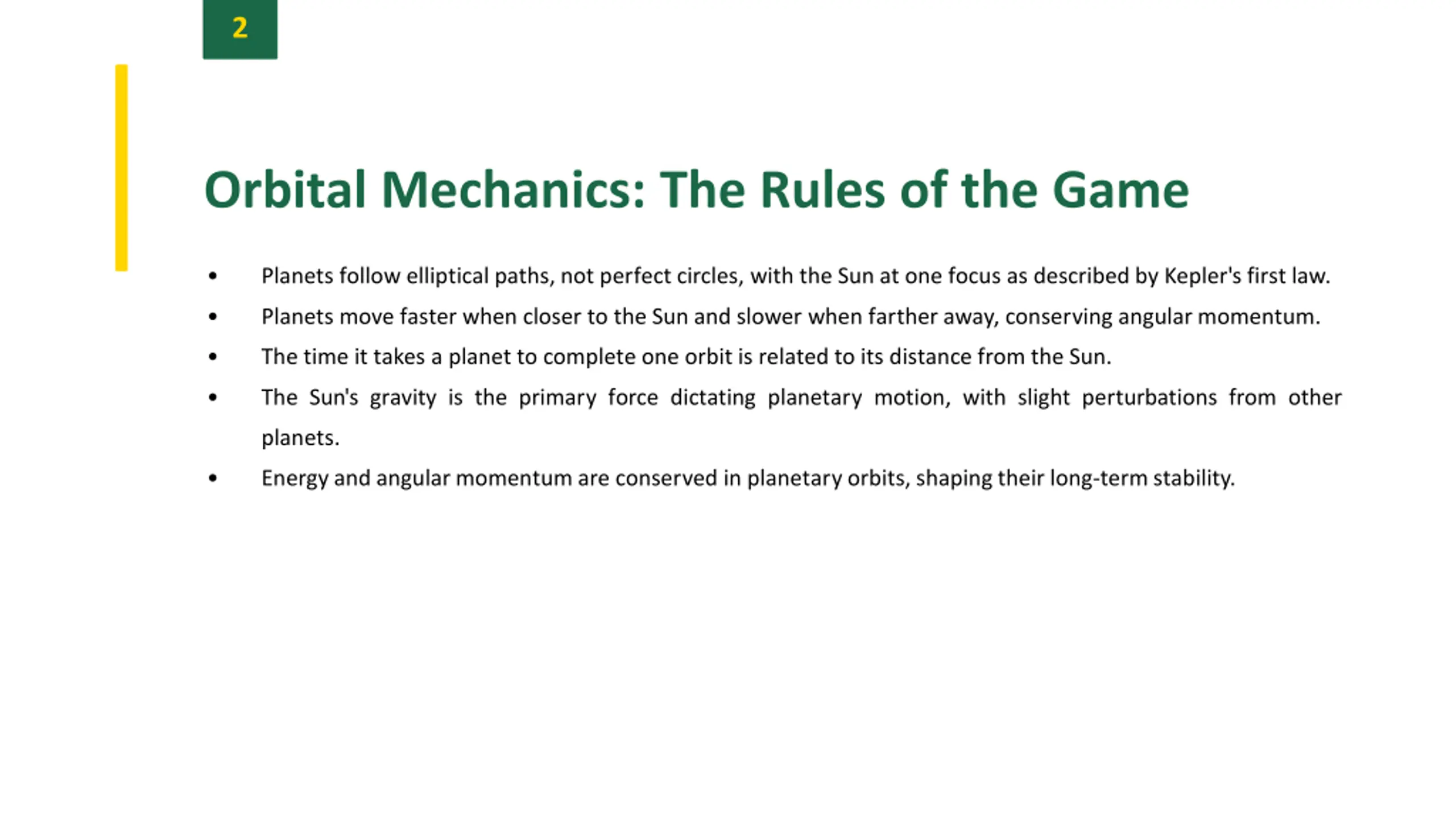 2 Orbital Mechanics: The Rules of the Game Planets follow elliptical paths, not perfect circles, with the Sun at one focus as described by Kepler's first law. Planets move faster when closer to the Sun and slower when farther away, conserving angular momentum. The time it takes a planet to complete one orbit is related to its distance from the Sun. The Sun's gravity is the primary force dictating planetary motion, with slight perturbations from other planets. Energy and angular momentum are conserved in planetary orbits, shaping their long-term stability.
