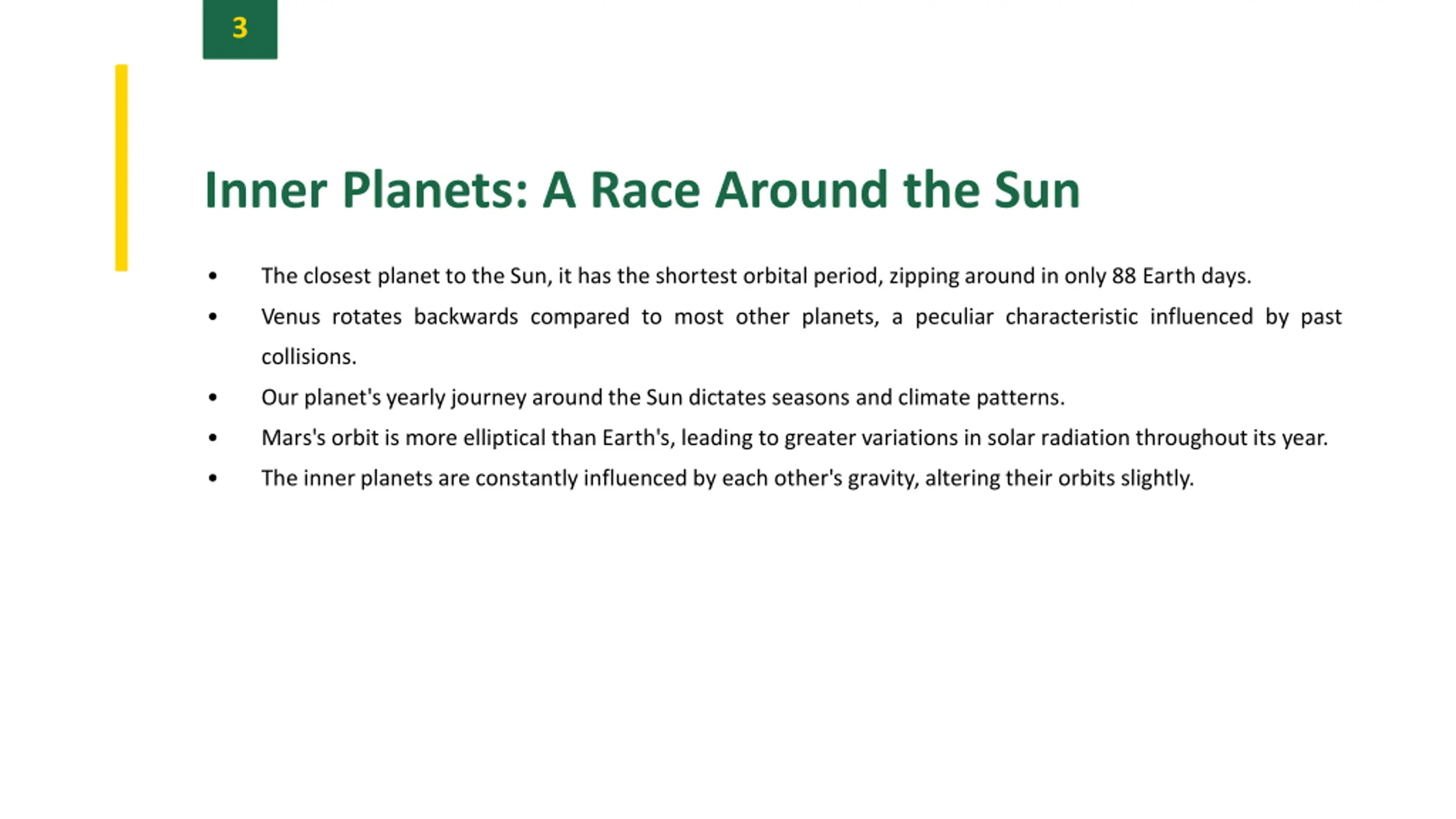 3 Inner Planets: A Race Around the Sun The closest planet to the Sun, it has the shortest orbital period, zippingaround in only 88 Earth days. Venus rotates backwards compared to most other planets, a peculiar characteristic influenced by past collisions. Our planet's yearly journey aroundthe Sun dictates seasons and climate patterns. Mars's orbit is more elliptical than Earth's, leading to greater variations in solar radiation throughoutits year. The inner planets are constantly influenced by each other's gravity, altering their orbits slightly.
