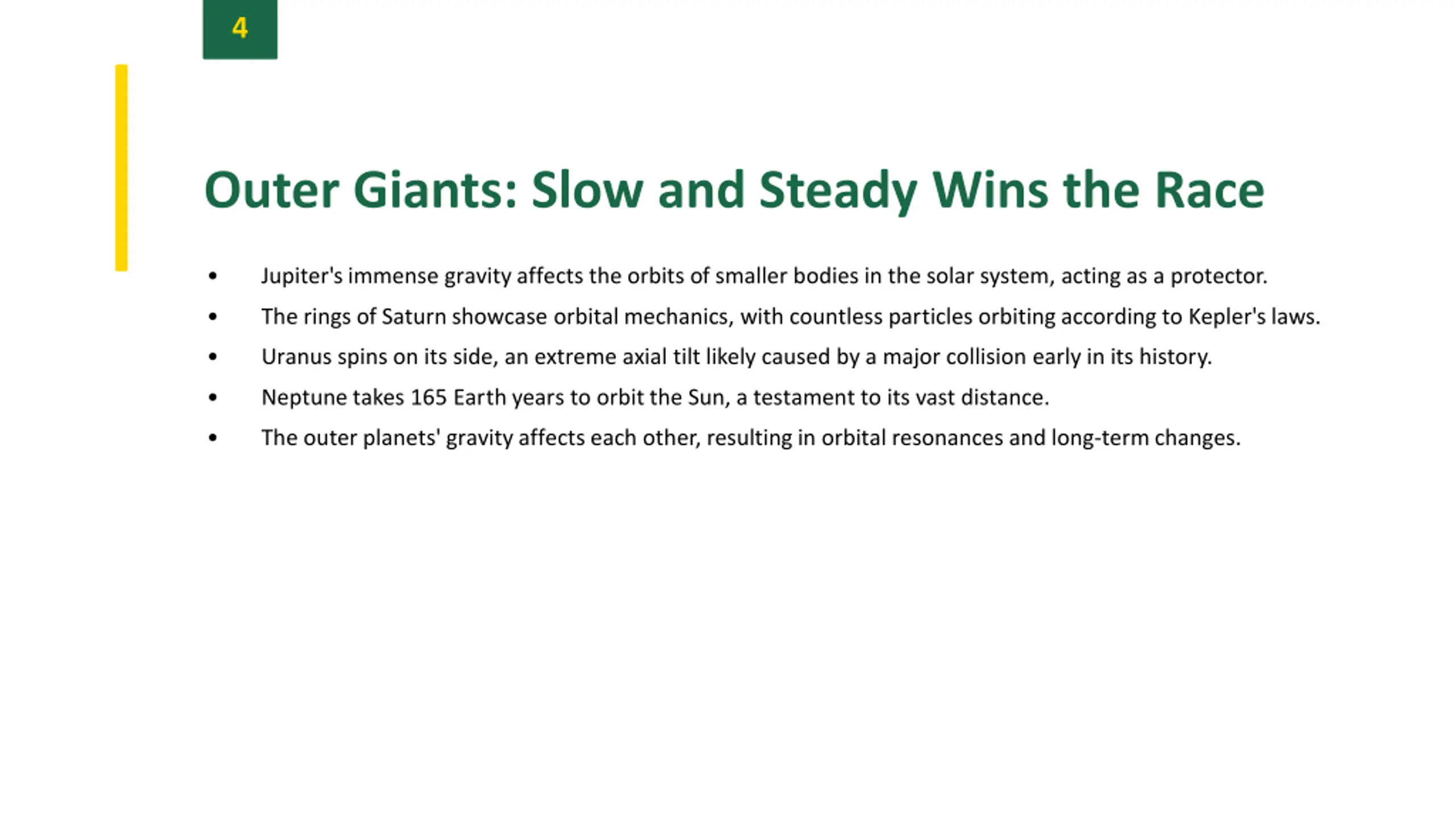 4 Outer Giants: Slow and Steady Wins the Race Jupiter's immense gravity affects the orbits of smaller bodies in the solar system, acting as a protector. The rings of Saturnshowcase orbital mechanics, with countless particles orbiting according to Kepler's laws. Uranus spins on its side, an extreme axial tilt likely caused by a major collision early in its history. Neptune takes 165 Earth years to orbit the Sun, a testament to its vast distance. The outer planets' gravity affects each other, resulting in orbital resonances and long-term changes.