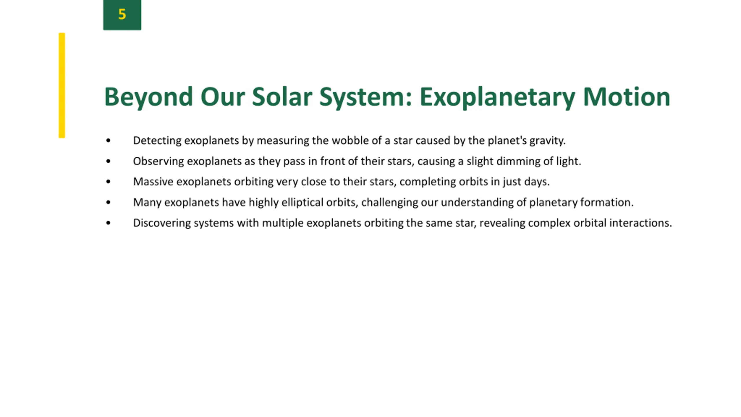5 Beyond Our Solar System: Exoplanetary Motion Detecting exoplanets by measuring the wobble of a star caused by the planet's gravity. Observing exoplanets as they pass in frontof their stars, causing a slight dimming of light. Massive exoplanets orbiting very close to their stars, completing orbits in just days. Many exoplanets have highly elliptical orbits, challenging our understanding of planetaryformation. Discovering systems with multiple exoplanets orbitingthe same star, revealing complex orbital interactions.