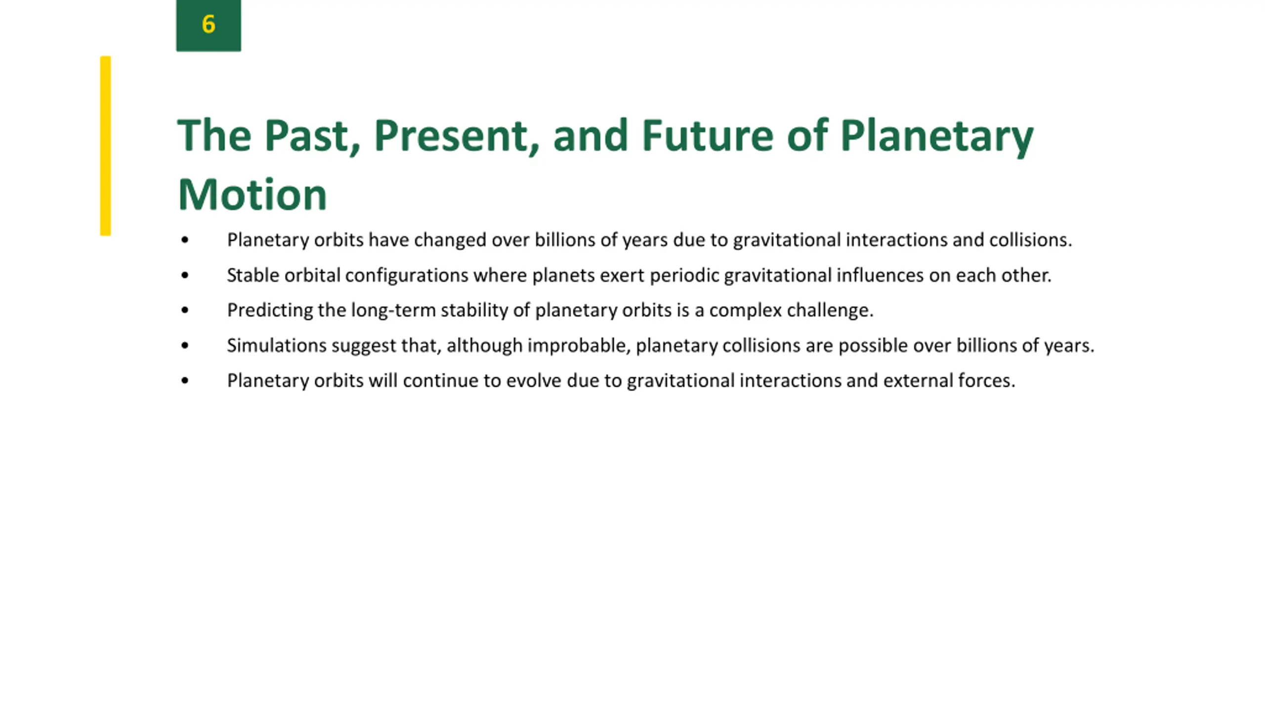 6 The Past, Present, and Future of Planetary Motion Planetary orbits have changed over billions of years due to gravitational interactions and collisions. Stable orbital configurations where planets exert periodic gravitational influences on each other. Predicting the long-term stability of planetary orbits is a complex challenge. Simulations suggest that, althoughimprobable, planetarycollisions are possible over billions of years. Planetary orbits will continue to evolve due to gravitational interactions and external forces.