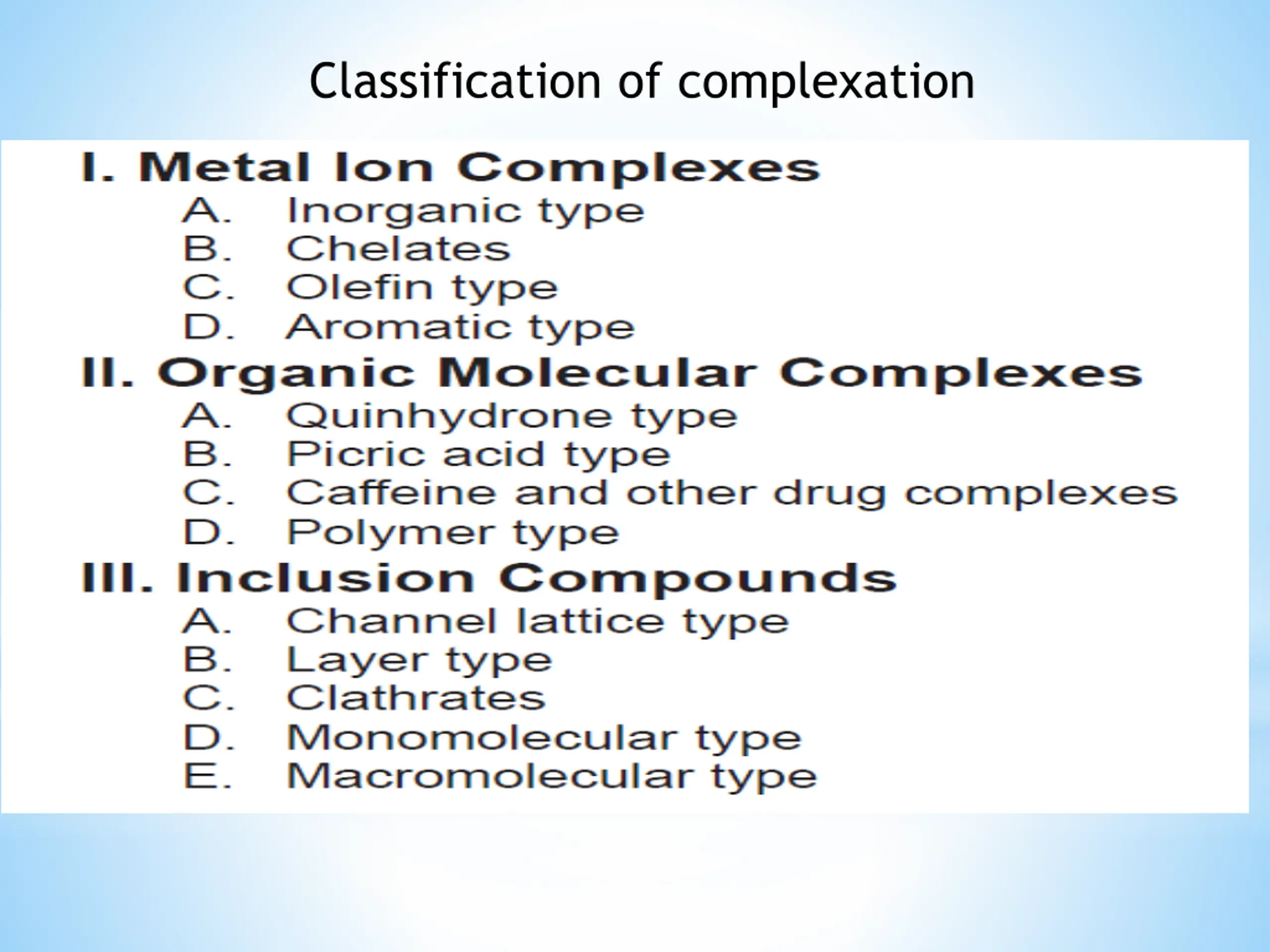 Explore the fascinating world of complexation in pharmacy through detailed images showcasing applications, classifications, metal complexes, chelates, organic molecular complexes, and specific compounds like quinhydrone, picric acid, caffeine, and polymer complexes. Delve into the intricacies and significance of complexation in pharmaceutical science.