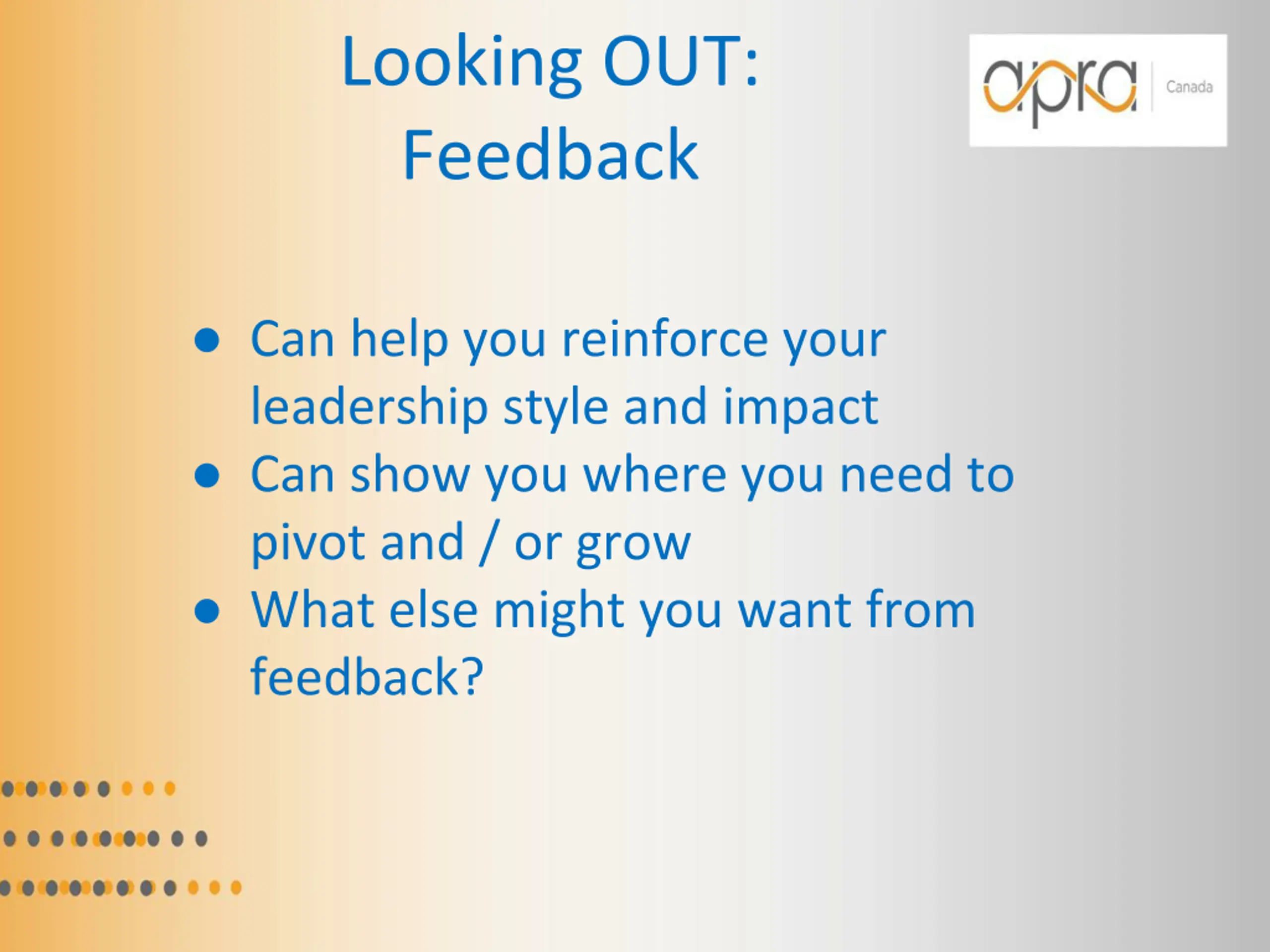Looking OUT: Feedback Can help you reinforce your leadership style and impact Can show you where you need to pivot and / or grow What else might you want from feedback?