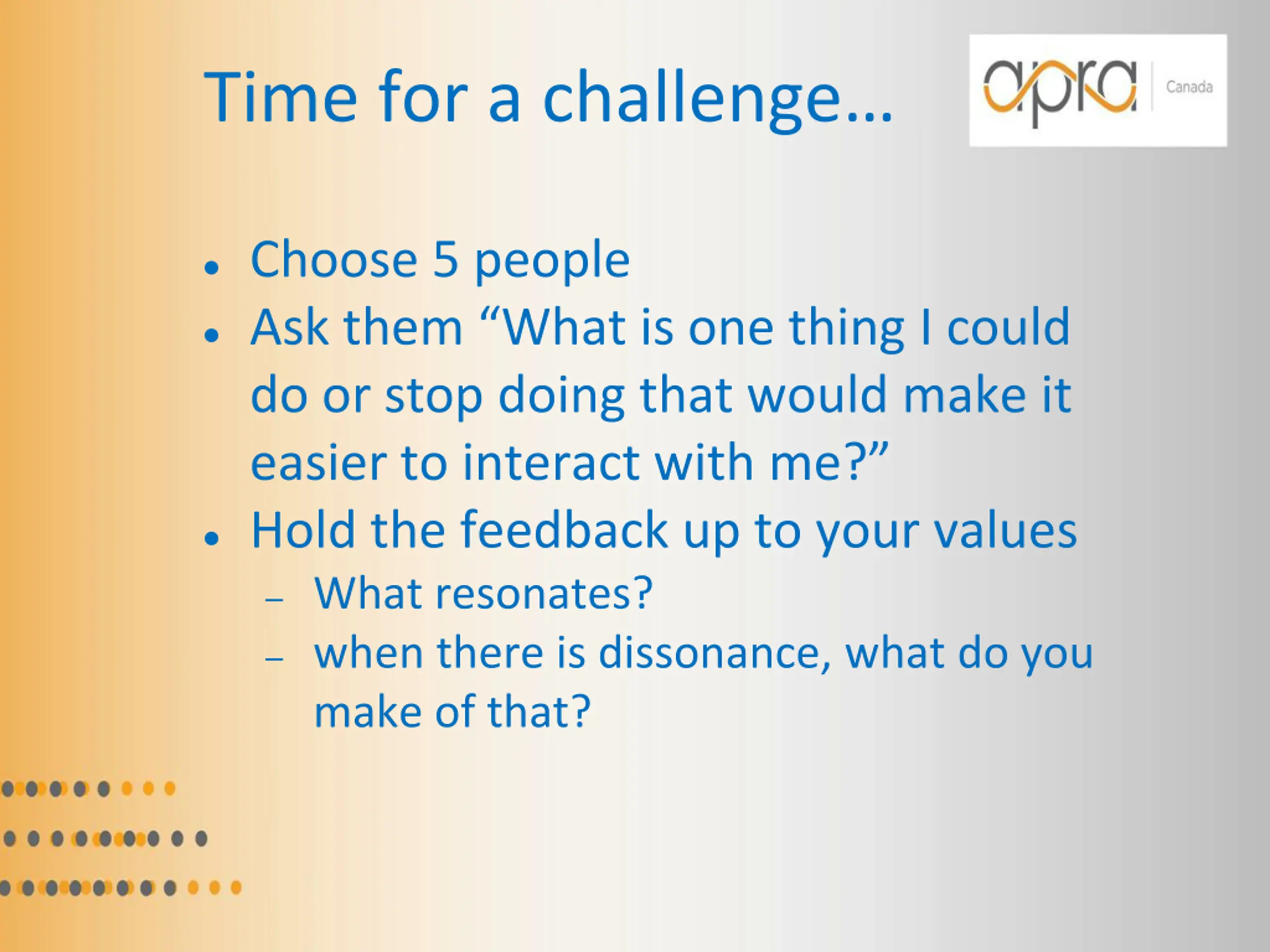 Time for a challenge Choose 5 people Ask them What is one thing I could do or stop doing that would make it easier to interact with me? Hold the feedback up to your values What resonates? when there is dissonance, what do you make of that?