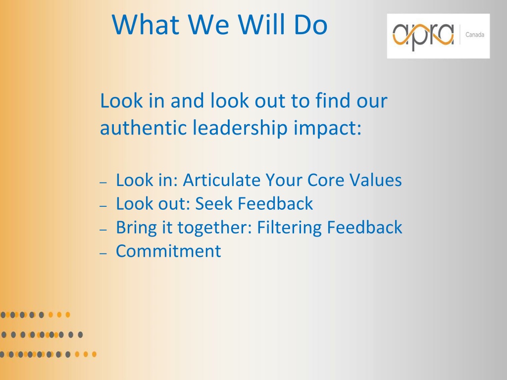 What We Will Do Look in and look out to find our authentic leadership impact: Look in: Articulate Your Core Values Look out: Seek Feedback Bring it together: Filtering Feedback Commitment