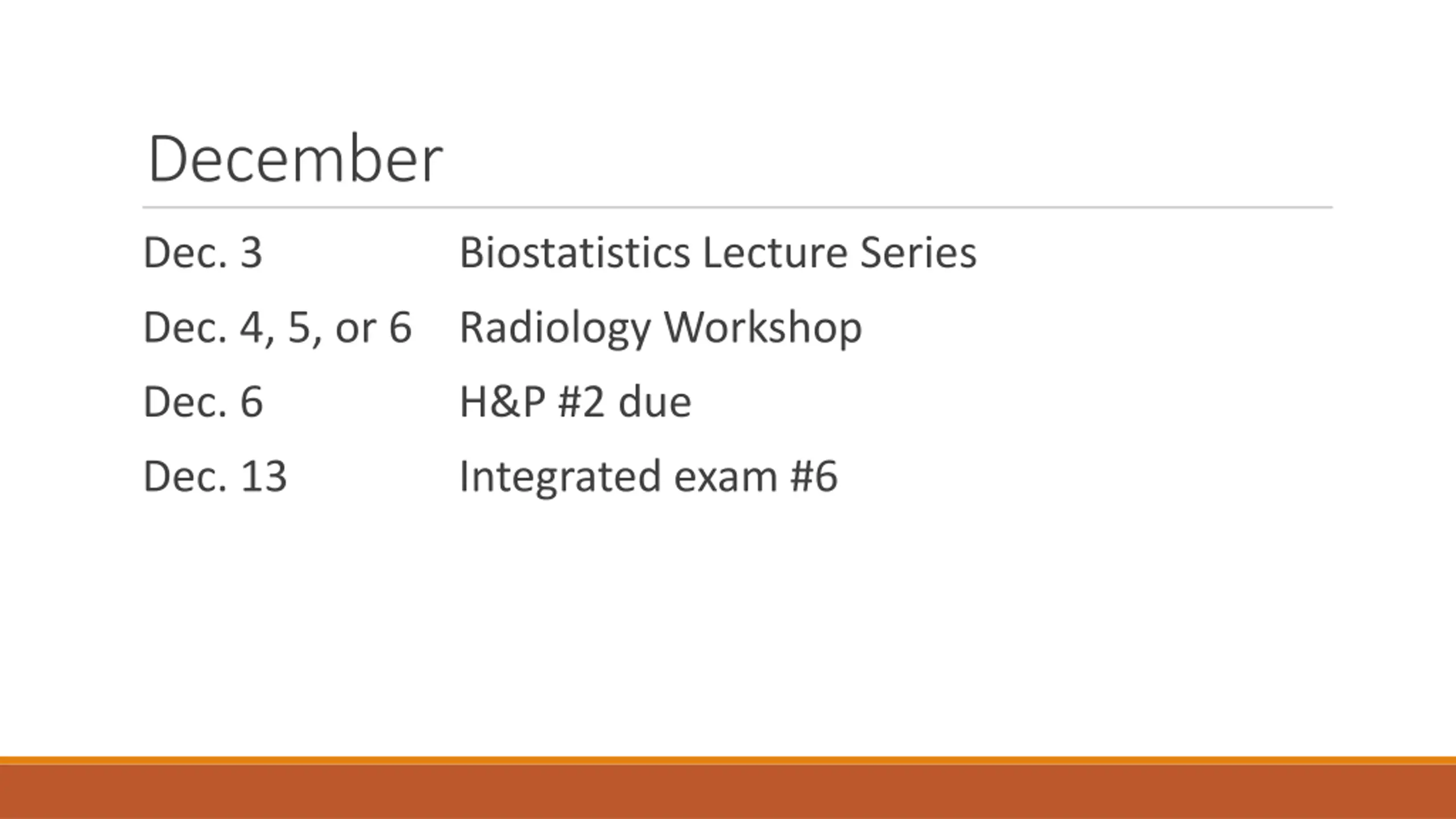 December Dec. 3 Biostatistics Lecture Series Dec. 4, 5, or 6 Radiology Workshop Dec. 6 H&P #2 due Dec. 13 Integrated exam #6
