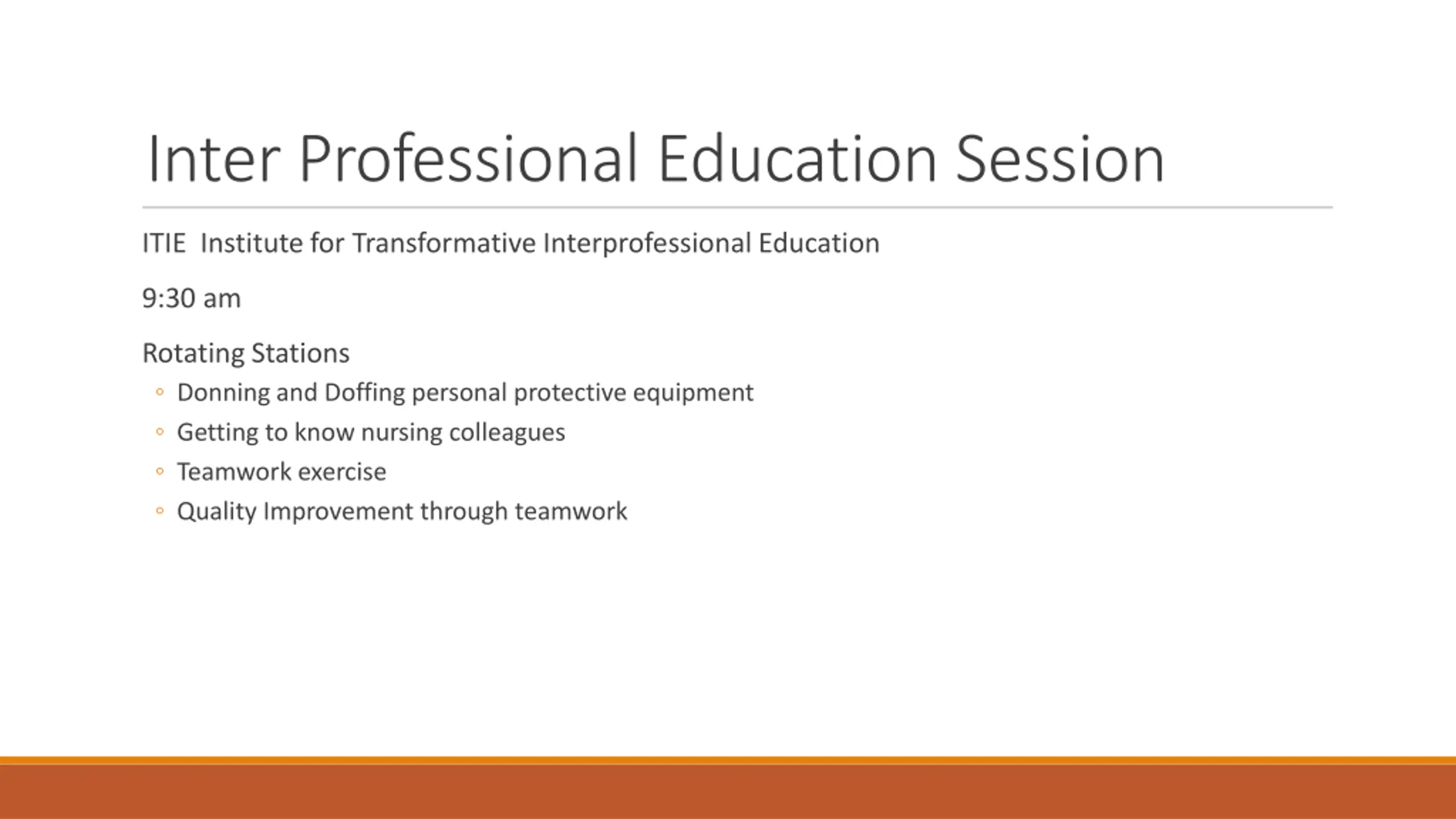 Inter Professional Education Session ITIE Institute for Transformative Interprofessional Education 9:30 am Rotating Stations Donning and Doffing personal protective equipment Getting to know nursing colleagues Teamwork exercise Quality Improvement through teamwork