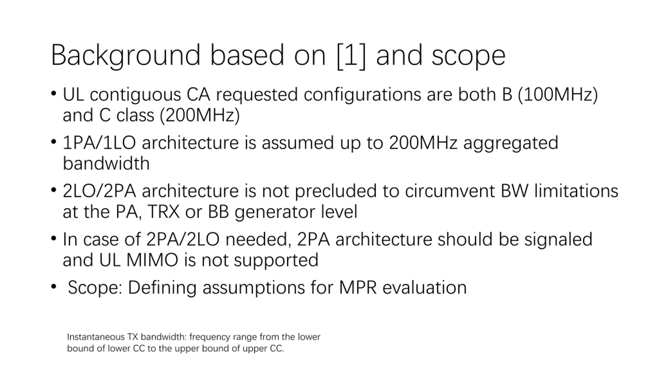 Background based on [1] and scope UL contiguous CA requested configurations are both B (100MHz) and C class (200MHz) 1PA/1LO architecture is assumed up to 200MHz aggregated bandwidth 2LO/2PA architecture is not precluded to circumvent BW limitations at the PA, TRX or BB generator level In case of 2PA/2LO needed, 2PA architecture should be signaled and UL MIMO is not supported Scope: Defining assumptions for MPR evaluation Instantaneous TX bandwidth: frequency range from the lower bound of lower CC to the upper bound of upper CC.
