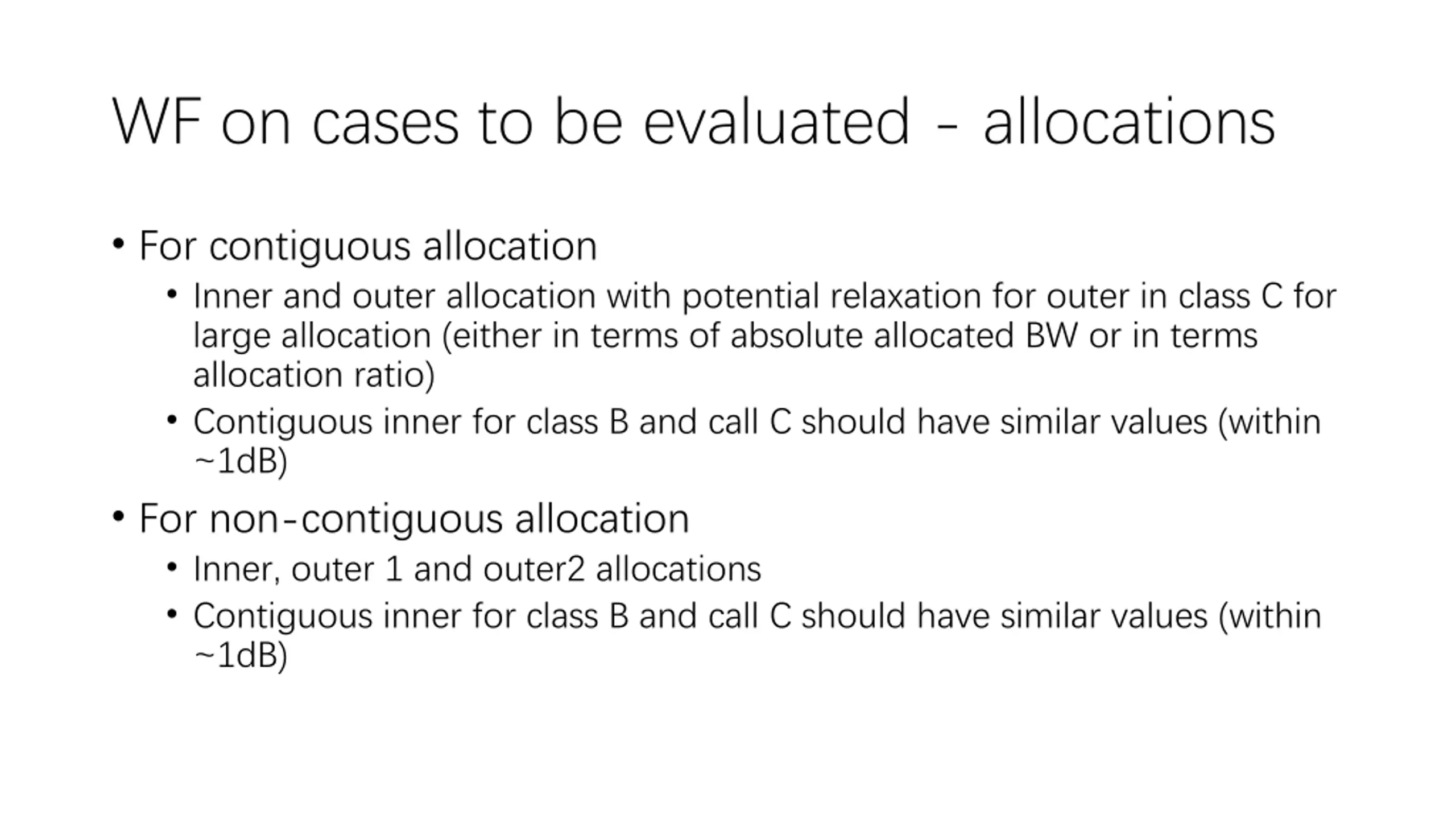 WF on cases to be evaluated - allocations For contiguous allocation Inner and outer allocation with potential relaxation for outer in class C for large allocation (either in terms of absolute allocated BW or in terms allocation ratio) Contiguous inner for class B and call C should have similar values (within ~1dB) For non-contiguous allocation Inner, outer 1 and outer2 allocations Contiguous inner for class B and call C should have similar values (within ~1dB)