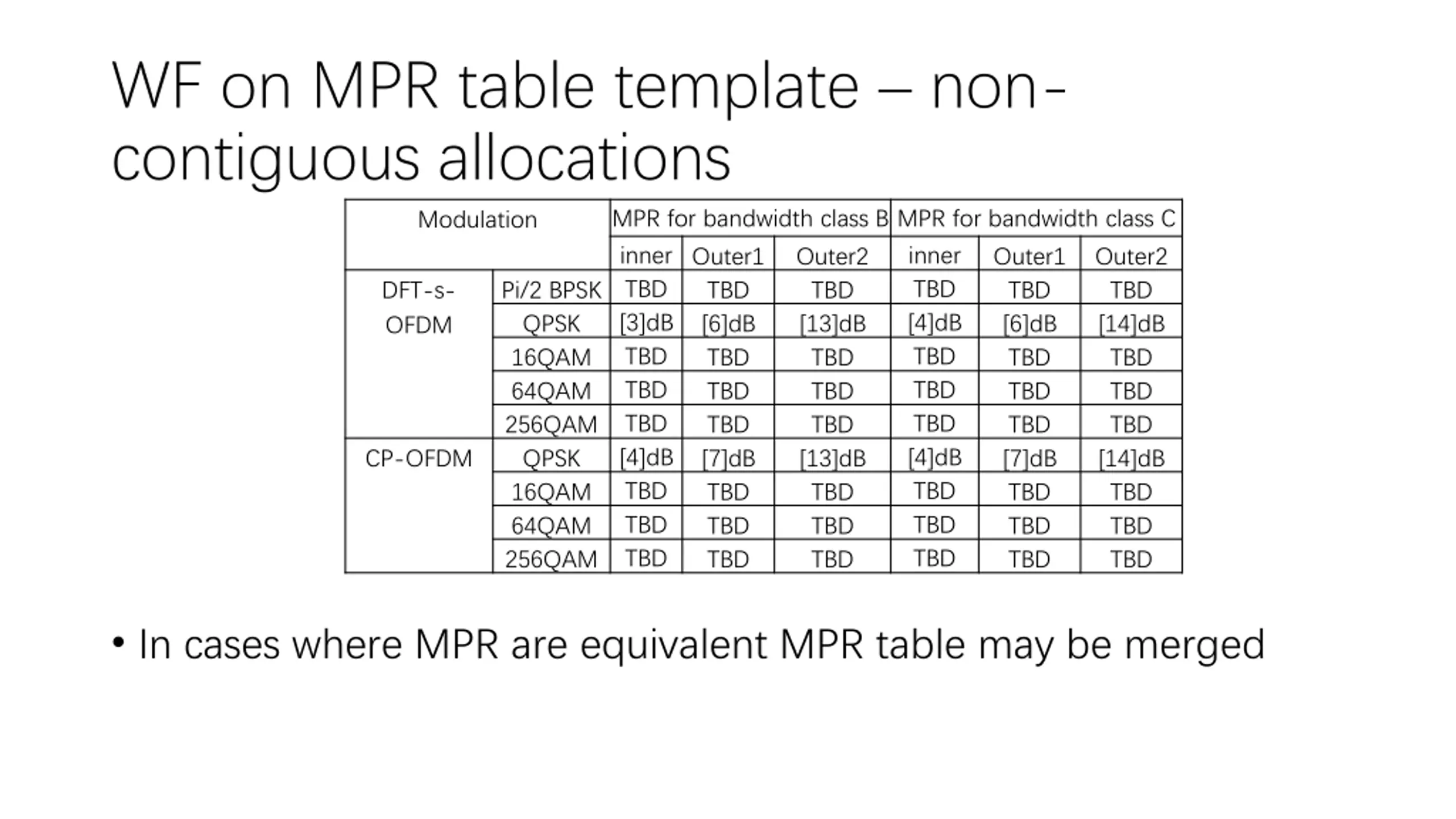 WF on MPR table template non- contiguous allocations MPR for bandwidth class B MPR for bandwidth class C inner Outer1 Outer2 TBD TBD TBD [3]dB [6]dB [13]dB TBD TBD TBD TBD TBD TBD TBD TBD TBD [4]dB [7]dB [13]dB TBD TBD TBD TBD TBD TBD TBD TBD TBD Modulation inner TBD [4]dB TBD TBD TBD [4]dB TBD TBD TBD Outer1 TBD [6]dB TBD TBD TBD [7]dB TBD TBD TBD Outer2 TBD [14]dB TBD TBD TBD [14]dB TBD TBD TBD DFT-s- OFDM Pi/2 BPSK QPSK 16QAM 64QAM 256QAM QPSK 16QAM 64QAM 256QAM CP-OFDM In cases where MPR are equivalent MPR table may be merged