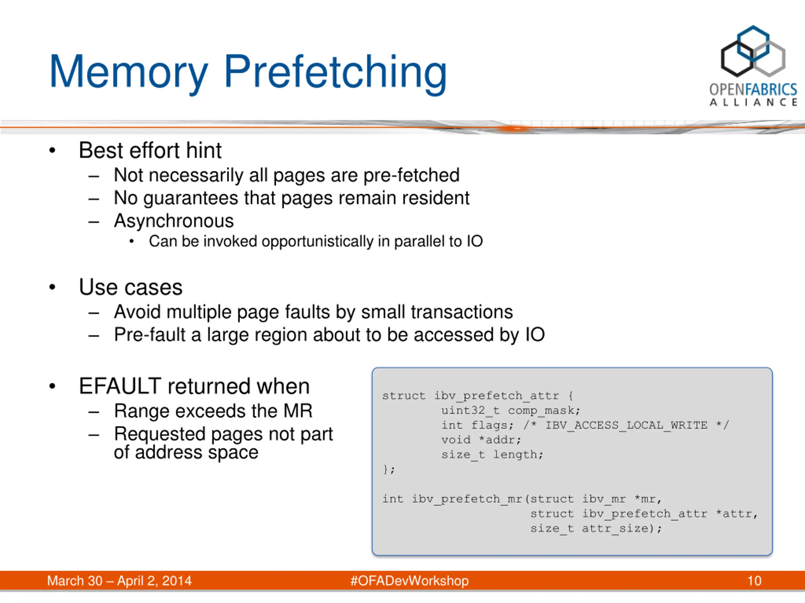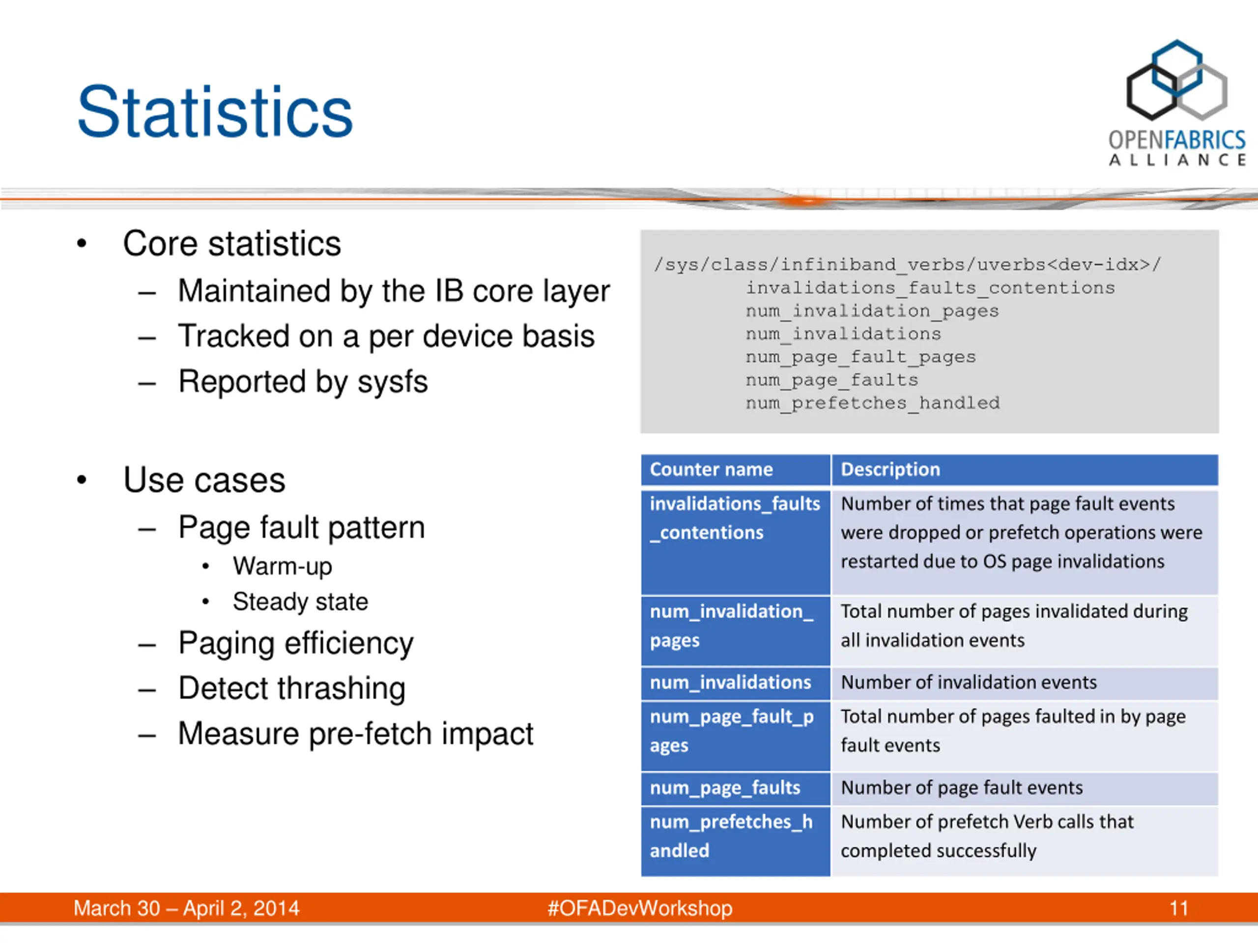 Memory Prefetching Best effort hint Not necessarily all pages are pre-fetched No guarantees that pages remain resident Asynchronous Can be invoked opportunistically in parallel to IO Use cases Avoid multiple page faults by small transactions Pre-fault a large region about to be accessed by IO EFAULT returned when Range exceeds the MR Requested pages not part of address space struct ibv_prefetch_attr { uint32_t comp_mask; int flags; /* IBV_ACCESS_LOCAL_WRITE */ void *addr; size_t length; }; int ibv_prefetch_mr(struct ibv_mr *mr, struct ibv_prefetch_attr *attr, size_t attr_size); March 30 April 2, 2014 #OFADevWorkshop 10