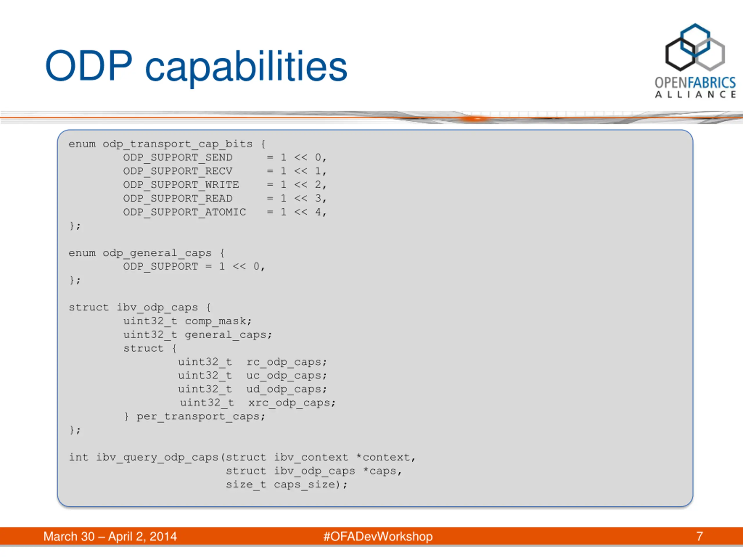 ODP capabilities enum odp_transport_cap_bits { ODP_SUPPORT_SEND = 1 << 0, ODP_SUPPORT_RECV = 1 << 1, ODP_SUPPORT_WRITE = 1 << 2, ODP_SUPPORT_READ = 1 << 3, ODP_SUPPORT_ATOMIC = 1 << 4, }; enum odp_general_caps { ODP_SUPPORT = 1 << 0, }; struct ibv_odp_caps { uint32_t comp_mask; uint32_t general_caps; struct { uint32_t rc_odp_caps; uint32_t uc_odp_caps; uint32_t ud_odp_caps; uint32_t xrc_odp_caps; } per_transport_caps; }; int ibv_query_odp_caps(struct ibv_context *context, struct ibv_odp_caps *caps, size_t caps_size); March 30 April 2, 2014 #OFADevWorkshop 7