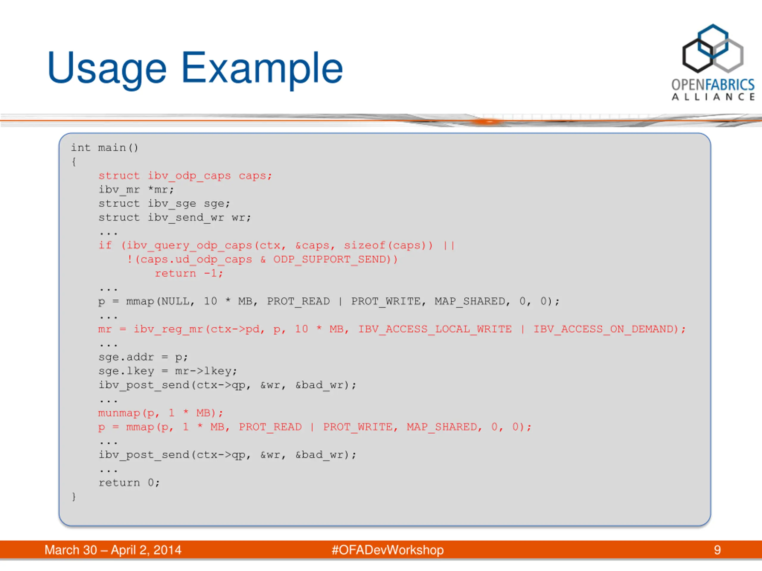 Usage Example int main() { struct ibv_odp_caps caps; ibv_mr *mr; struct ibv_sge sge; struct ibv_send_wr wr; ... if (ibv_query_odp_caps(ctx, &caps, sizeof(caps)) || !(caps.ud_odp_caps & ODP_SUPPORT_SEND)) return -1; ... p = mmap(NULL, 10 * MB, PROT_READ | PROT_WRITE, MAP_SHARED, 0, 0); ... mr = ibv_reg_mr(ctx->pd, p, 10 * MB, IBV_ACCESS_LOCAL_WRITE | IBV_ACCESS_ON_DEMAND); ... sge.addr = p; sge.lkey = mr->lkey; ibv_post_send(ctx->qp, &wr, &bad_wr); ... munmap(p, 1 * MB); p = mmap(p, 1 * MB, PROT_READ | PROT_WRITE, MAP_SHARED, 0, 0); ... ibv_post_send(ctx->qp, &wr, &bad_wr); ... return 0; } March 30 April 2, 2014 #OFADevWorkshop 9