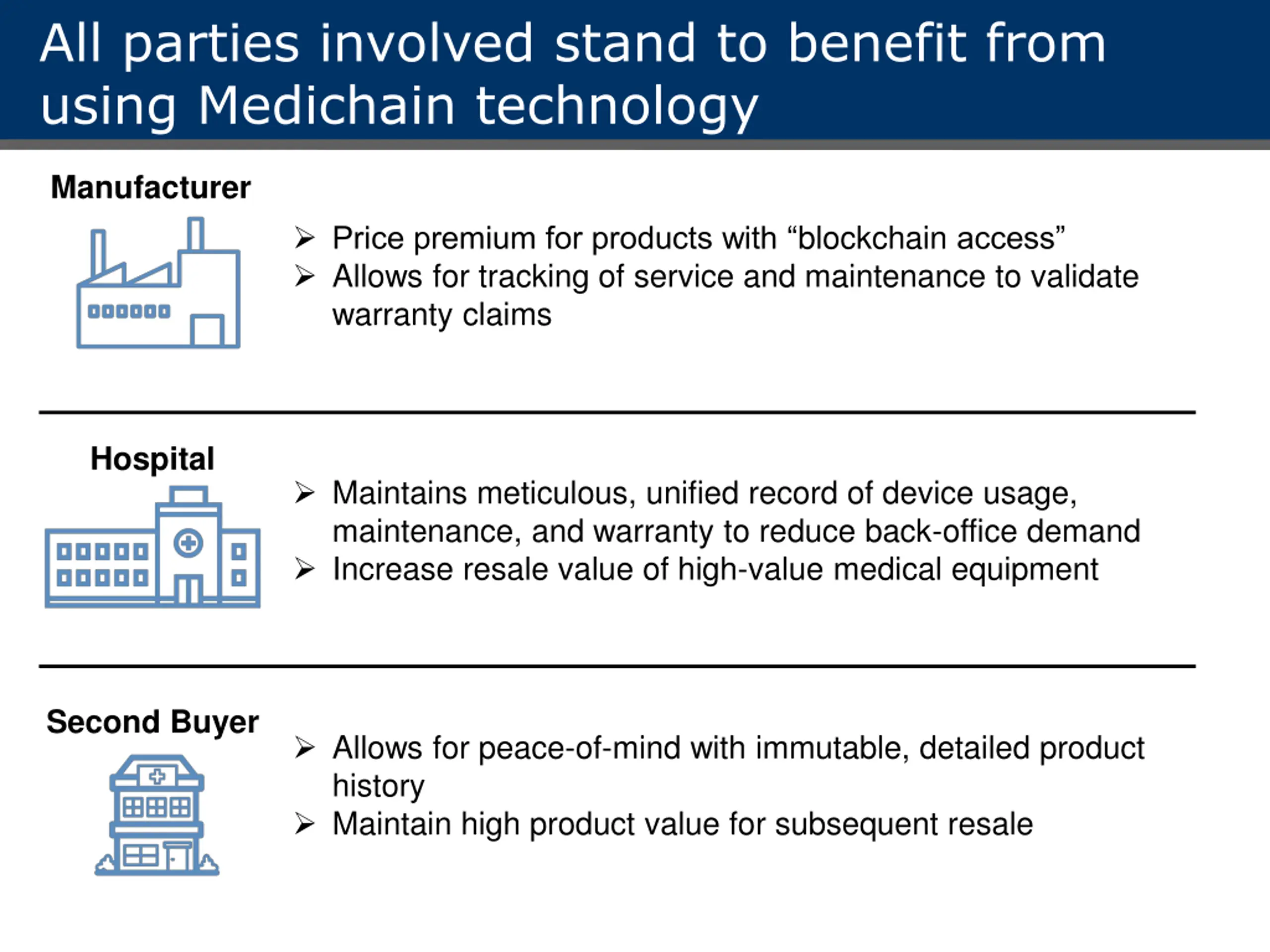 All parties involved stand to benefit from using Medichain technology Manufacturer Price premium for products with blockchain access Allows for tracking of service and maintenance to validate warranty claims Hospital Maintains meticulous, unified record of device usage, maintenance, and warranty to reduce back-office demand Increase resale value of high-value medical equipment Second Buyer Allows for peace-of-mind with immutable, detailed product history Maintain high product value for subsequent resale BOS
