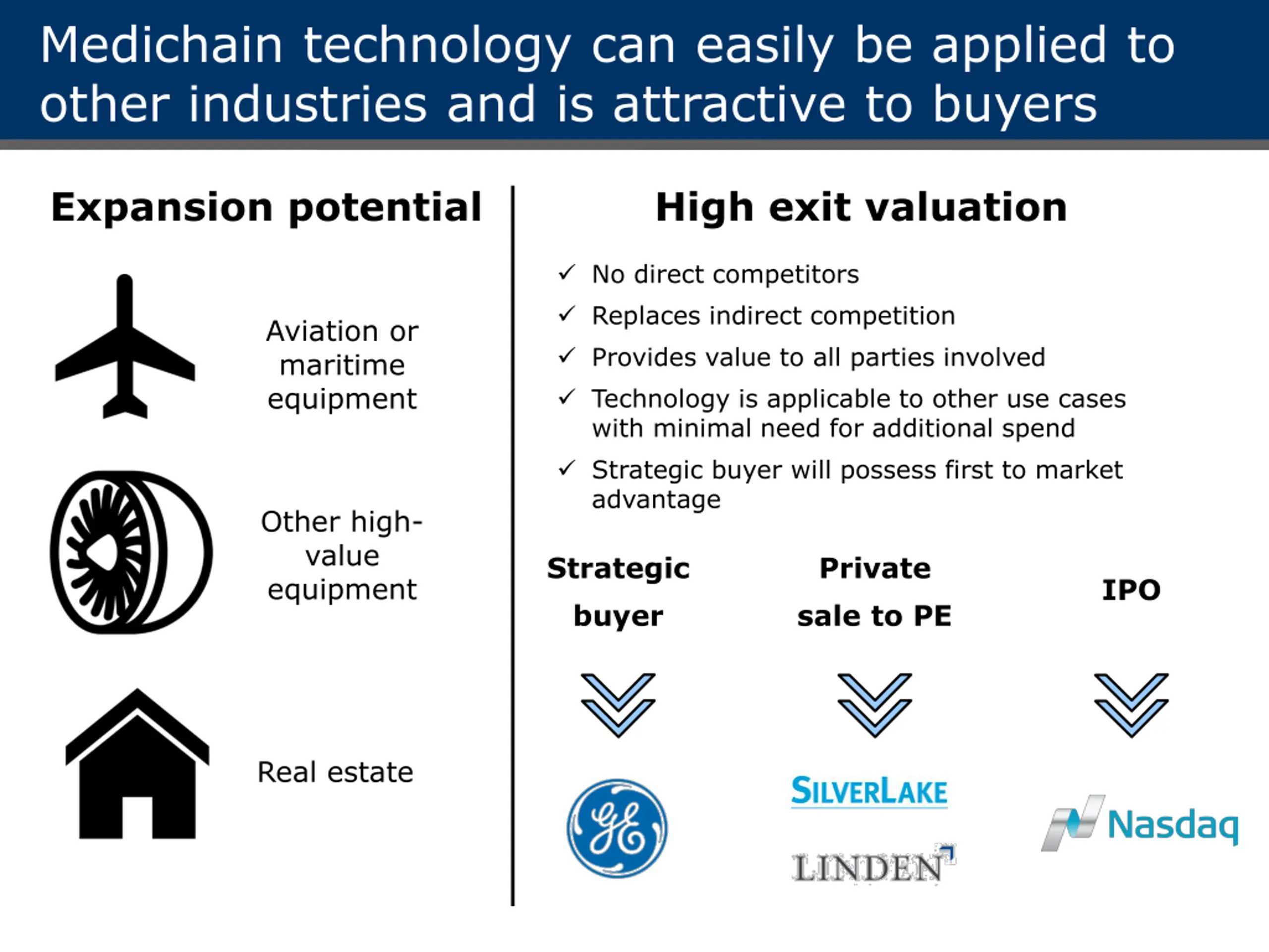 Medichain technology can easily be applied to other industries and is attractive to buyers Expansion potential High exit valuation No direct competitors Replaces indirect competition Provides value to all parties involved Technology is applicable to other use cases with minimal need for additional spend Strategic buyer will possess first to market advantage Aviation or maritime equipment Other high- value equipment Strategic buyer Private sale to PE IPO Realestate BOS