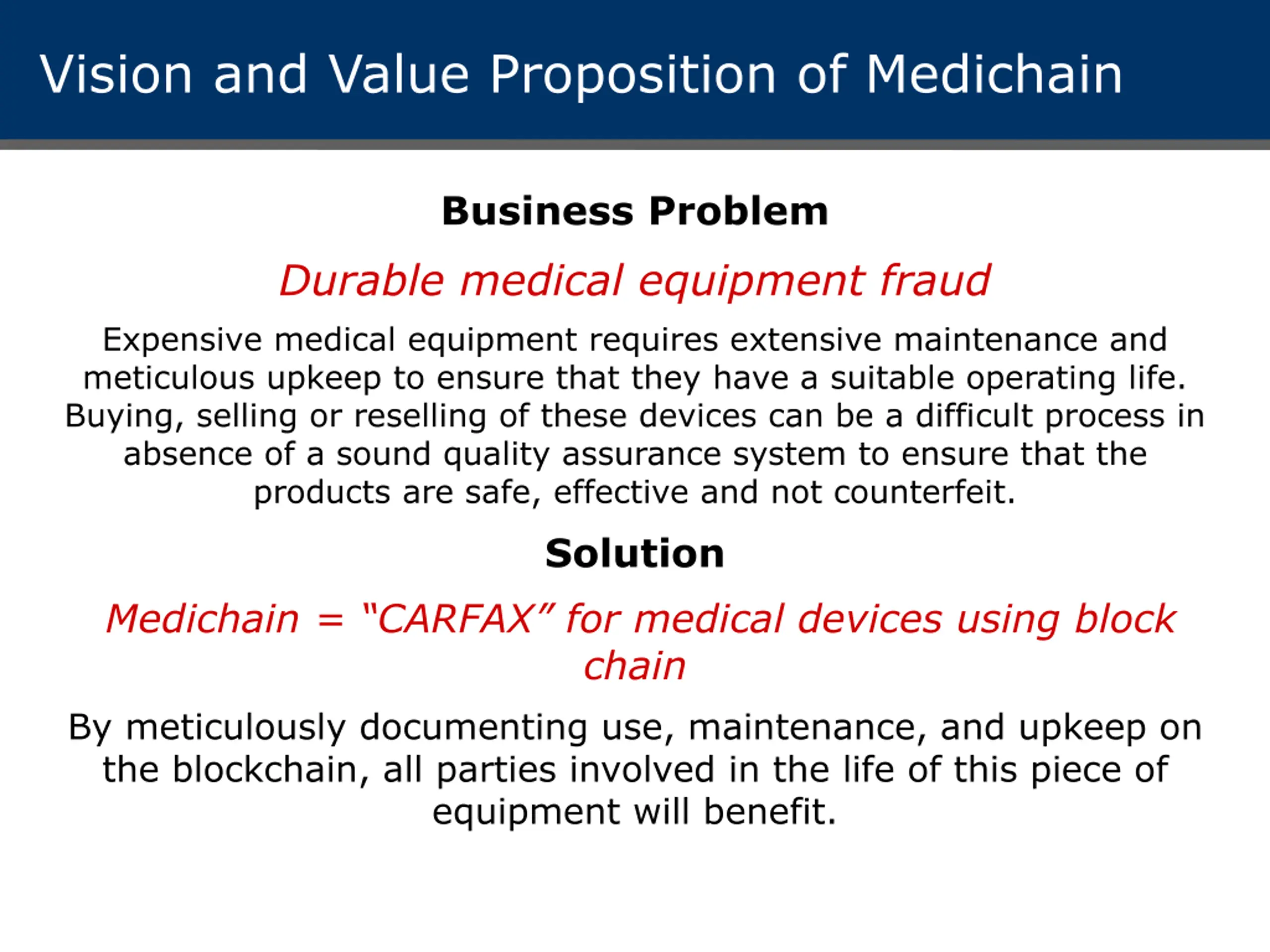 Vision and Value Proposition of Medichain Business Problem Durable medical equipment fraud Expensive medical equipment requires extensive maintenance and meticulous upkeep to ensure that they have a suitable operating life. Buying, selling or reselling of these devices can be a difficult process in absence of a sound quality assurance system to ensure that the products are safe, effective and not counterfeit. Solution Medichain = CARFAX for medical devices using block chain By meticulously documenting use, maintenance, and upkeep on the blockchain, all parties involved in the life of this piece of equipment will benefit. BOS