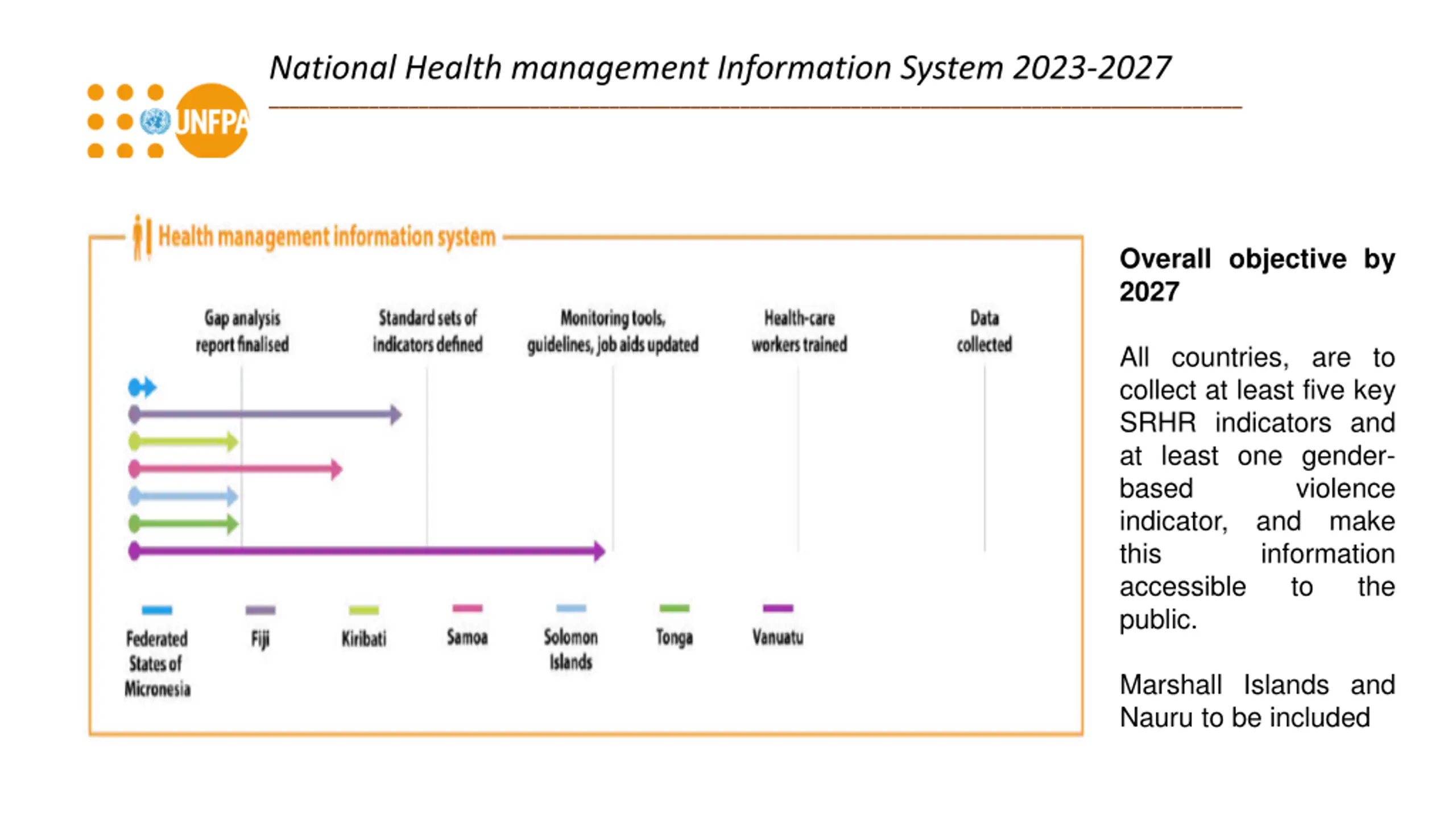 National Health management Information System _________________________________________________________________________________________________ Support to countries to ensure Sexual and reproductive health indicators are routinely collected as part of the national health information system and made publicly available. To date, gap analysis has been completed for Fiji, Kiribati, Tonga, Samoa, Solomon Islands, and Vanuatu and are now focusing on the next phase. Baseline: 0 (2022); Target:6 (2027)