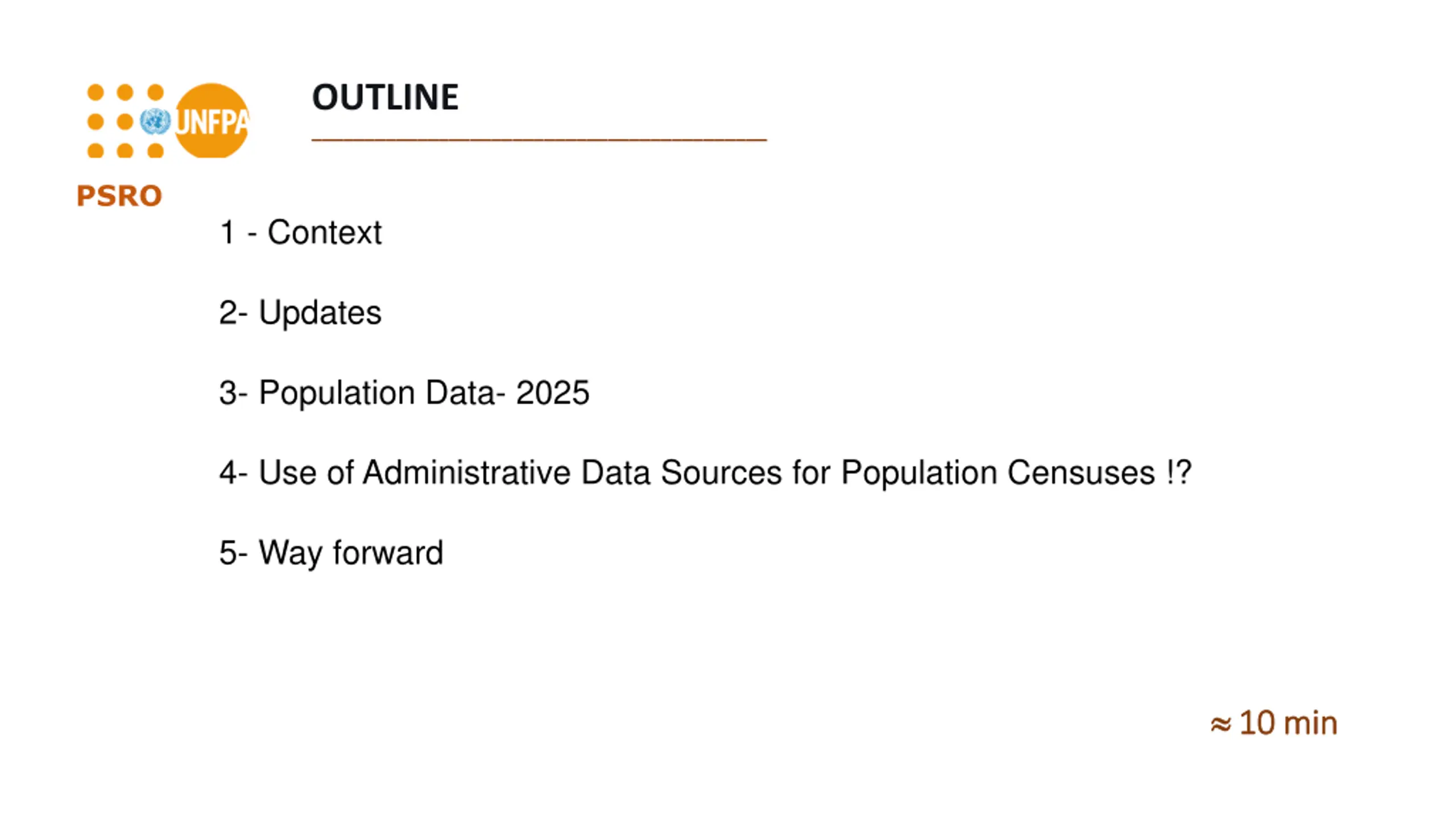 OUTLINE ___________________________________________ PSRO 1 - Context 2- Updates 3- Population Data- 2025 4- Use of Administrative Data Sources for Population Censuses !? 5- Way forward 10 min 10 min