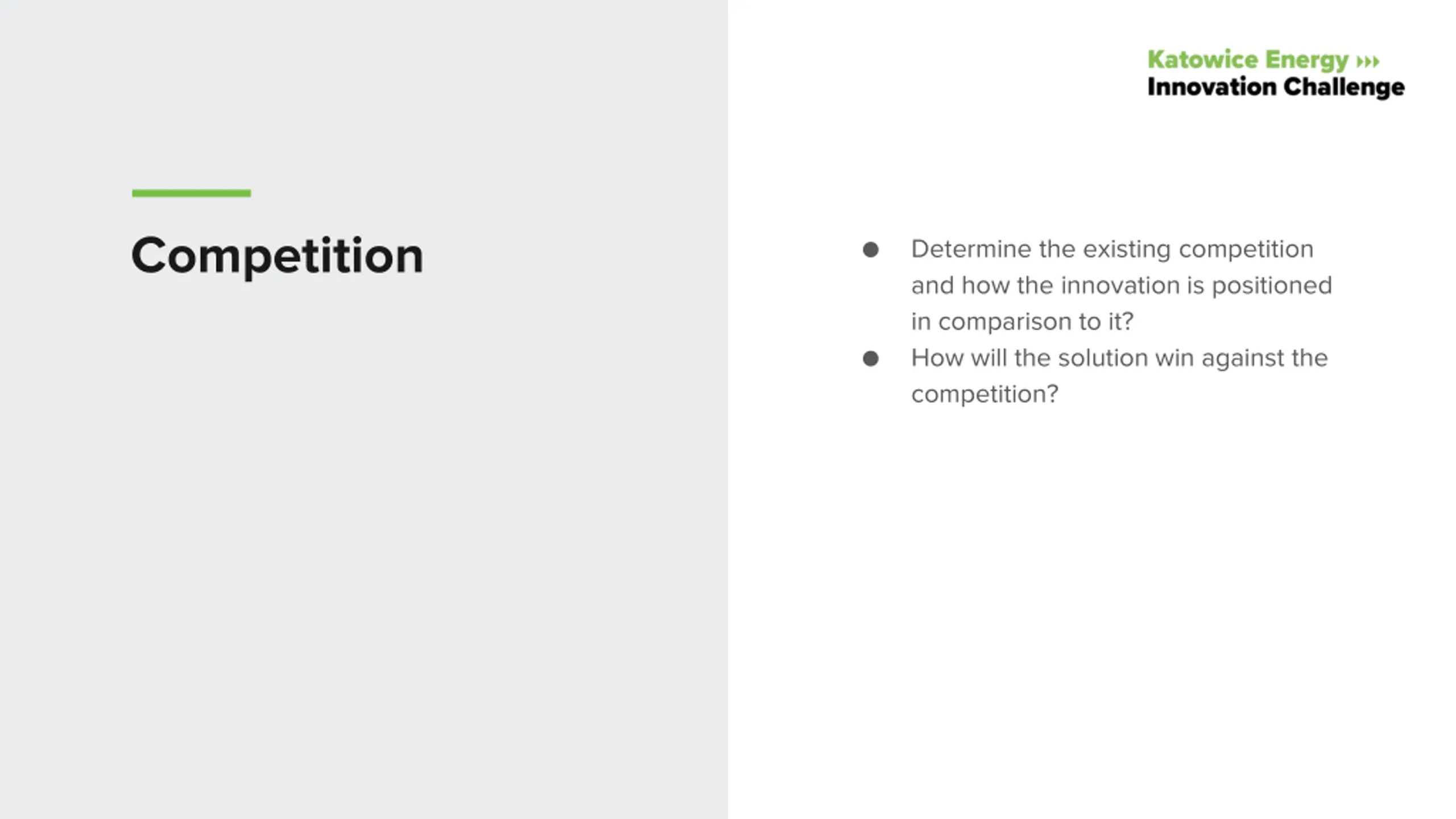 Competition Determine the existing competition and how the innovation is positioned in comparison to it? How will the solution win against the competition?