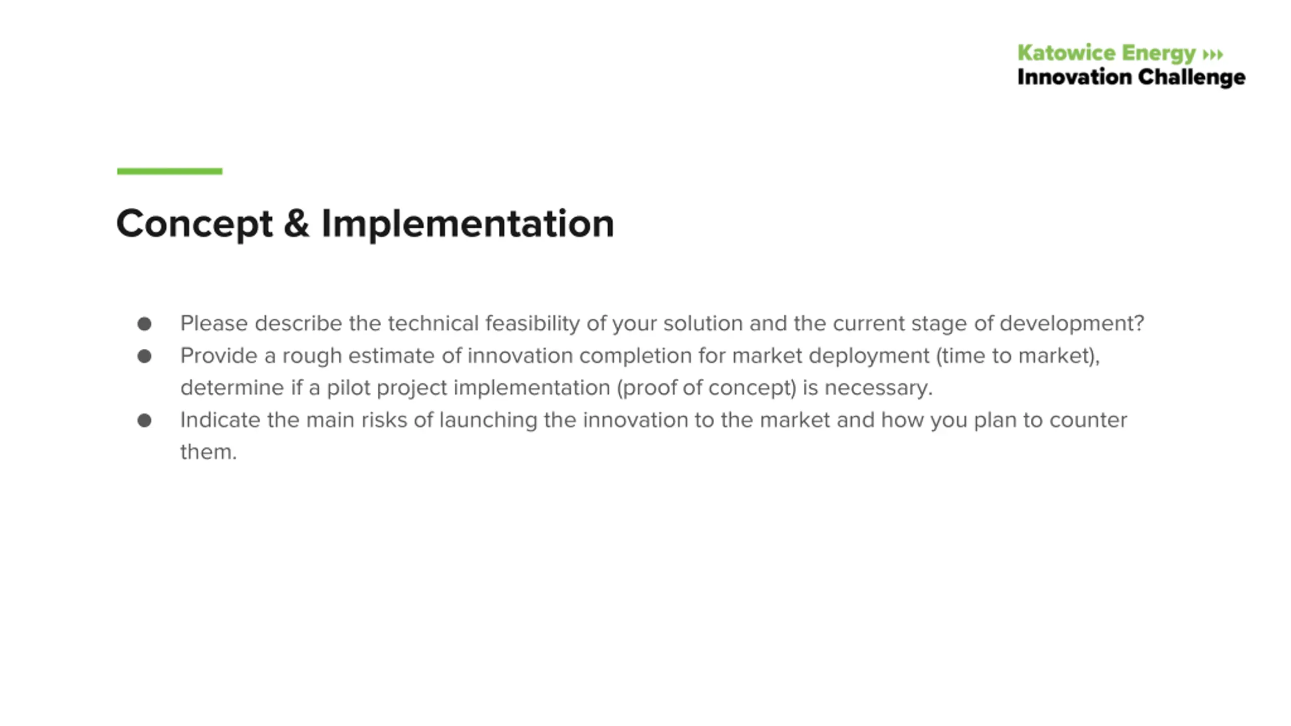 Concept & Implementation Please describe the technical feasibility of your solution and the current stage of development? Provide a rough estimate of innovation completion for market deployment (time to market), determine if a pilot project implementation (proof of concept) is necessary. Indicate the main risks of launching the innovation to the market and how you plan to counter them.