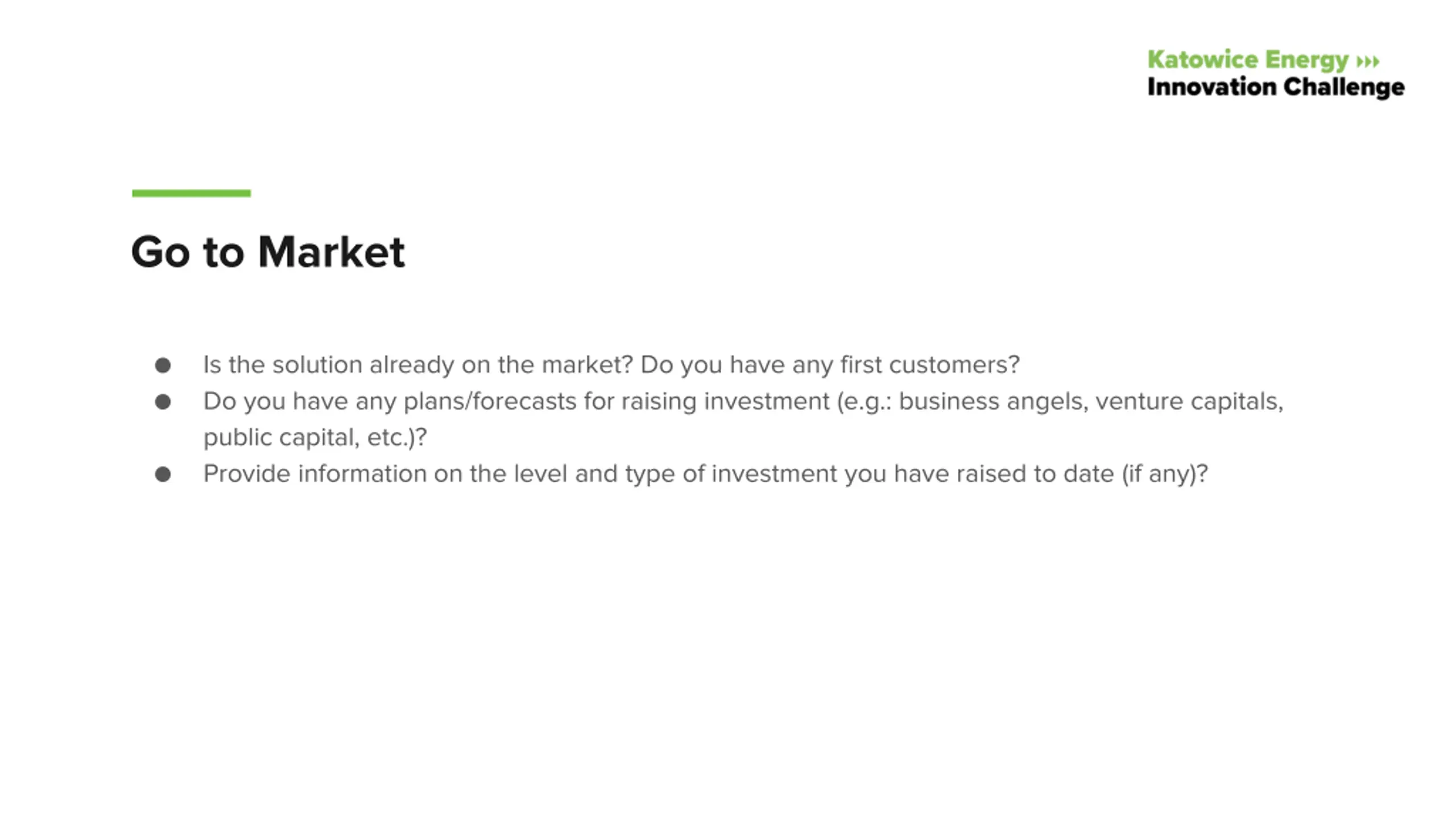 Go to Market Is the solution already on the market? Do you have any first customers? Do you have any plans/forecasts for raising investment (e.g.: business angels, venture capitals, public capital, etc.)? Provide information on the level and type of investment you have raised to date (if any)?