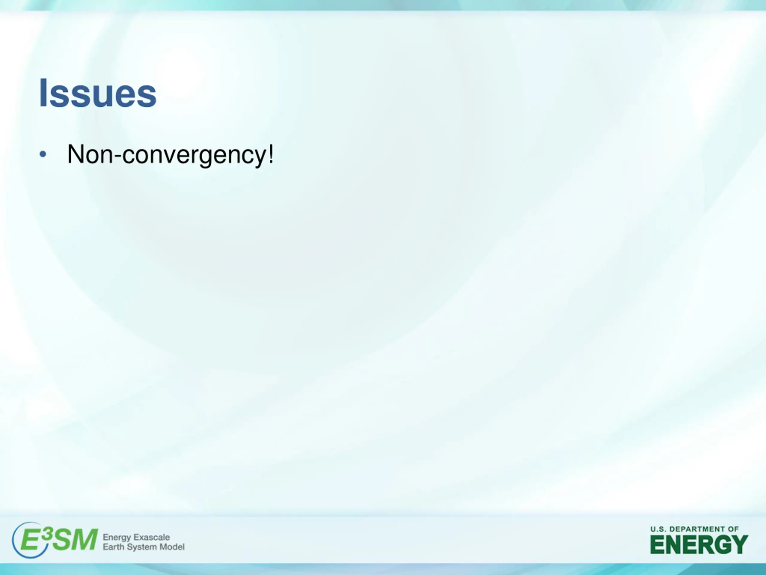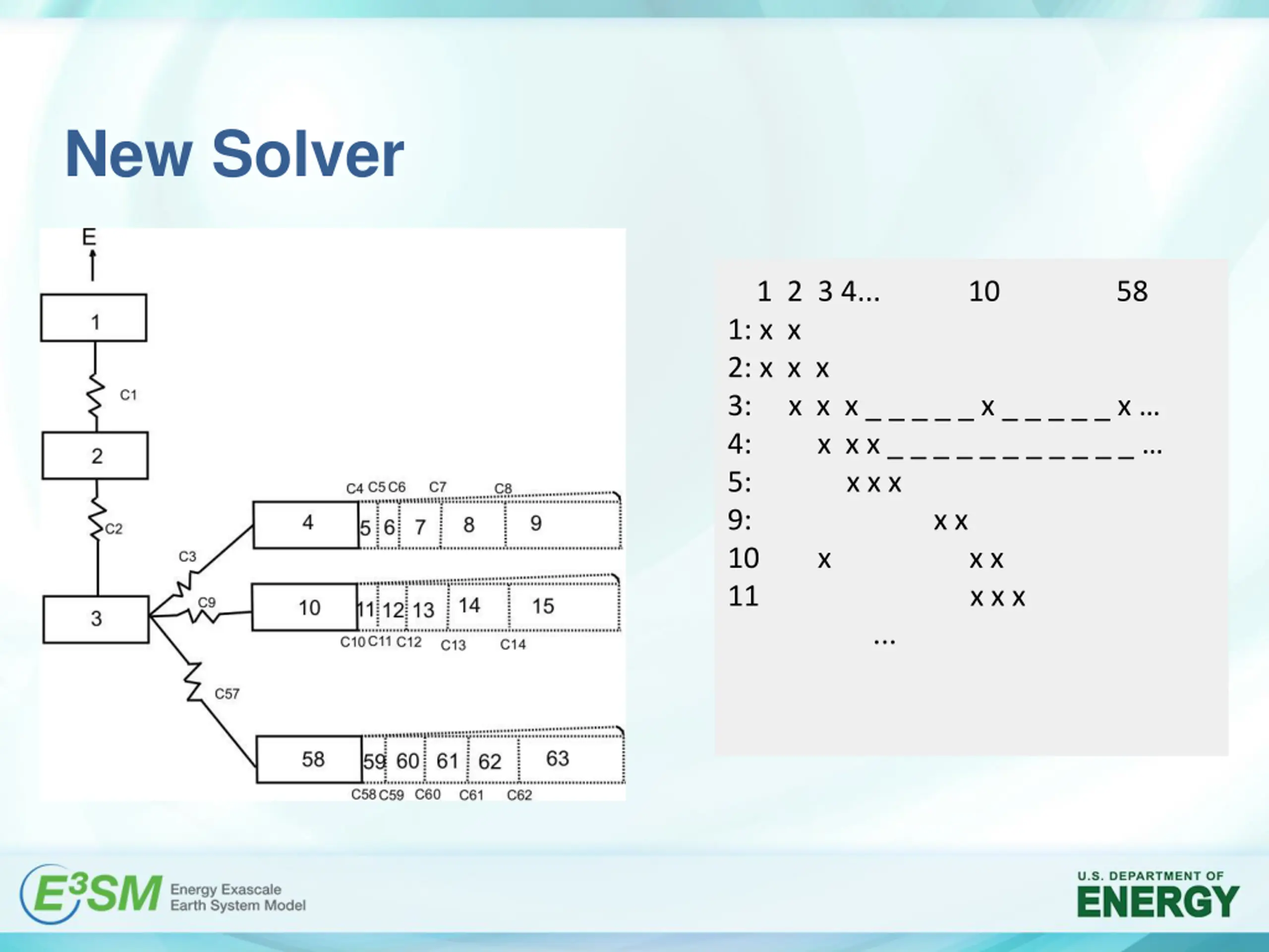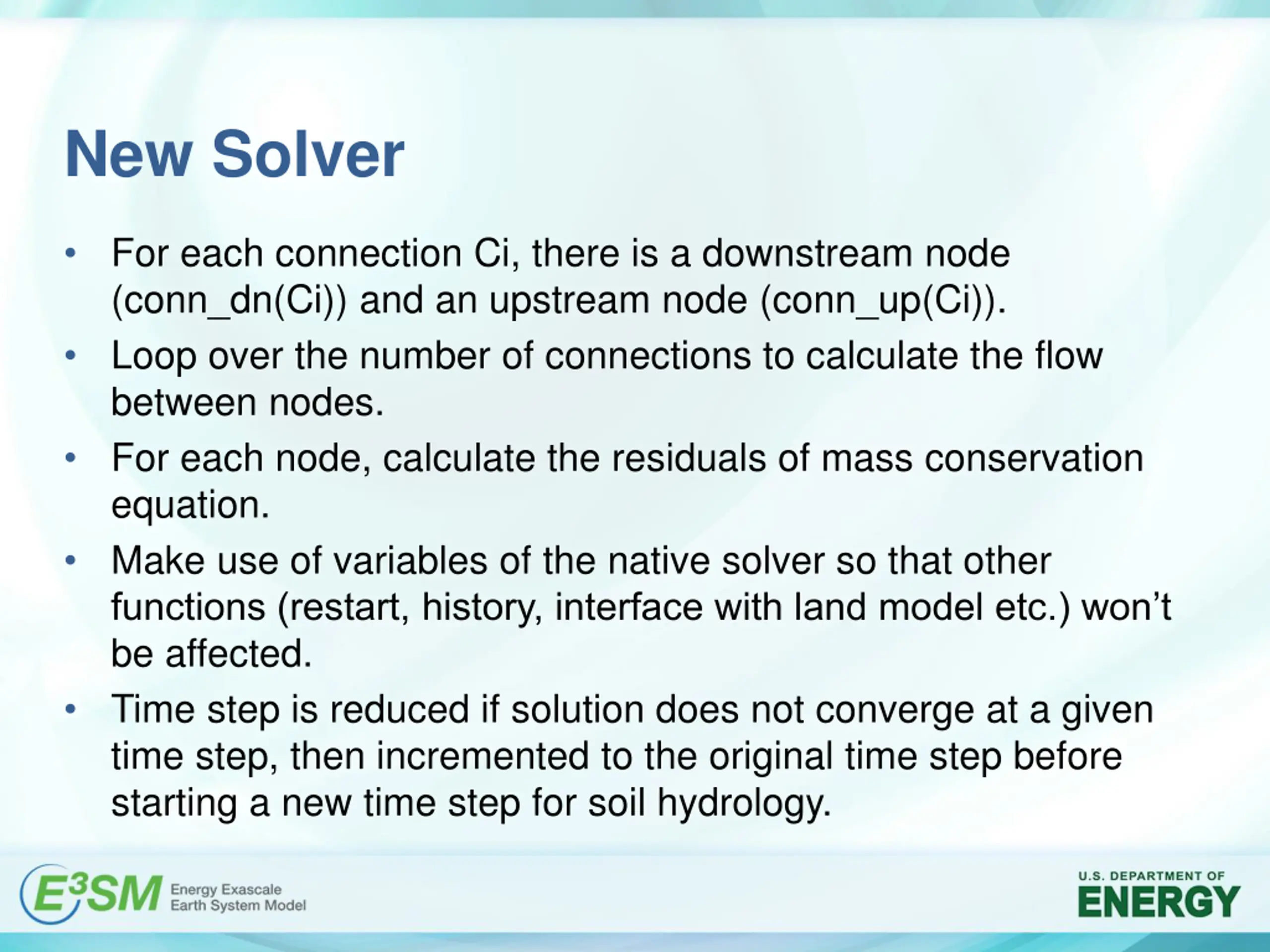 New Solver For each connection Ci, there is a downstream node (conn_dn(Ci)) and an upstream node (conn_up(Ci)). Loop over the number of connections to calculate the flow between nodes. For each node, calculate the residuals of mass conservation equation. Make use of variables of the native solver so that other functions (restart, history, interface with land model etc.) won t be affected. Time step is reduced if solution does not converge at a given time step, then incremented to the original time step before starting a new time step for soil hydrology.