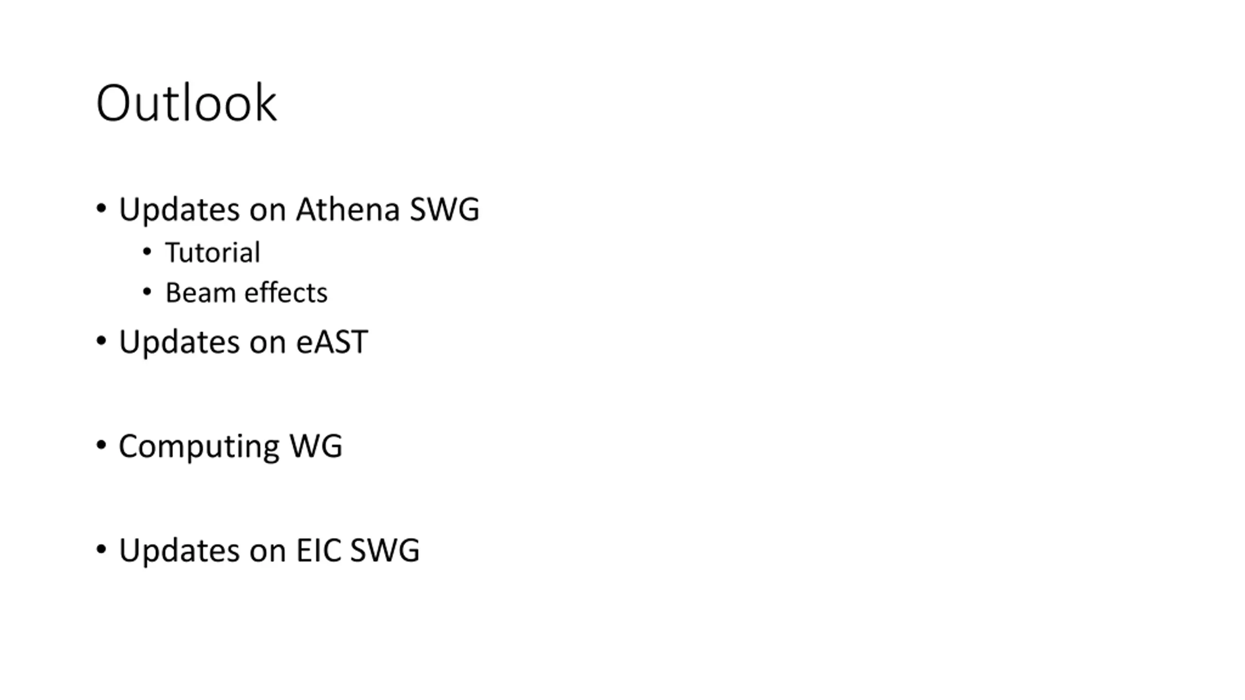 Outlook Updates on Athena SWG Tutorial Beam effects Updates on eAST Computing WG Updates on EIC SWG