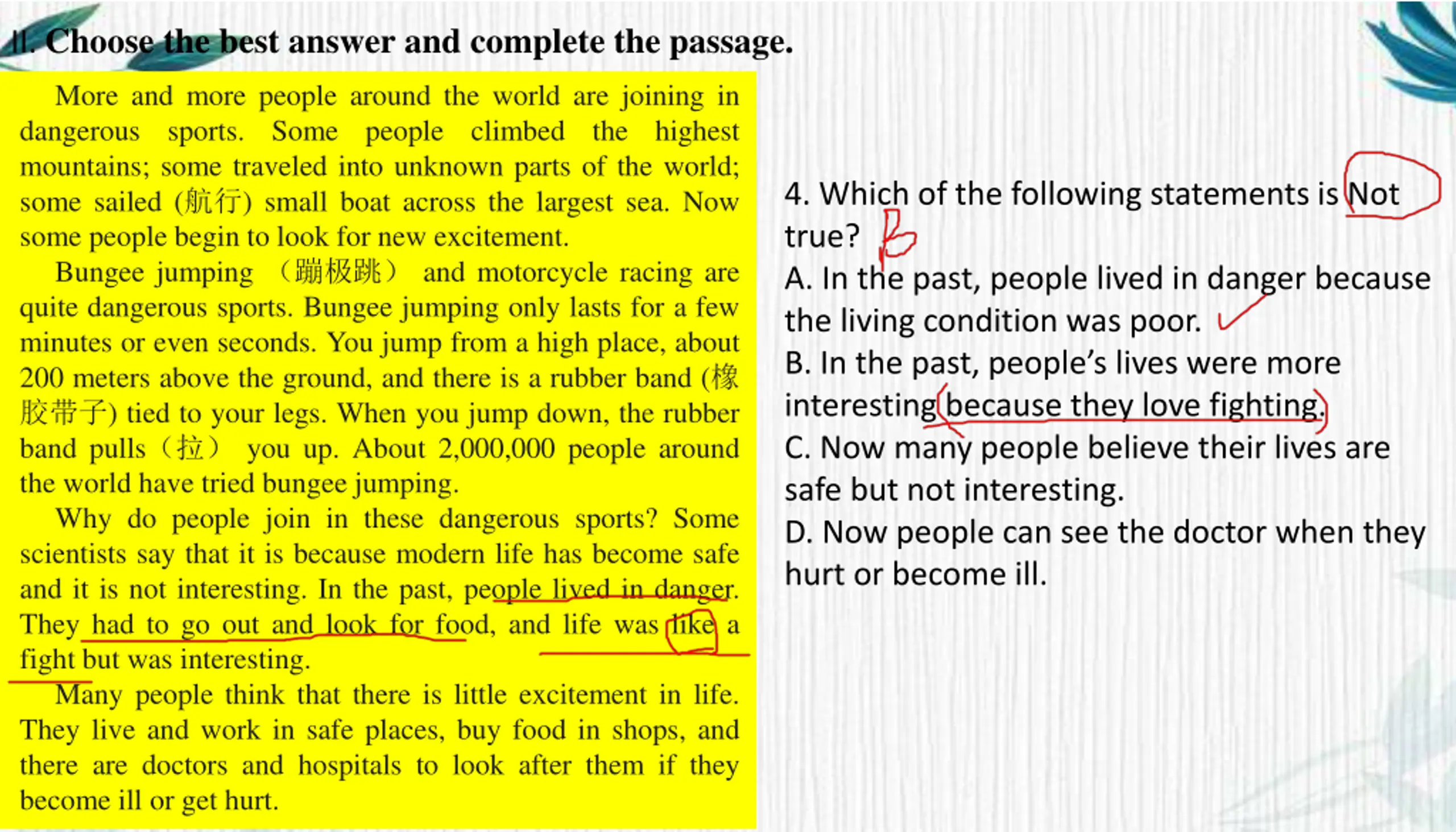 II. Choose the best answer and complete the passage. More and more people around the world are joining in dangerous sports. Some people mountains; some traveled into unknown parts of the world; some sailed ( ) small boat across the largest sea. Now some people begin to look for new excitement. Bungee jumping and motorcycle racing are quite dangerous sports. Bungee jumping only lasts for a few minutes or even seconds. You jump from a high place, about 200 meters above the ground, and there is a rubber band ( ) tied to your legs. When you jump down, the rubber band pulls you up. About 2,000,000 people around the world have tried bungee jumping. Why do people join in these dangerous sports? Some scientists say that it is because modern life has become safe and it is not interesting. In the past, people lived in danger. They had to go out and look for food, and life was like a fight but was interesting. Many people think that there is little excitement in life. They live and work in safe places, buy food in shops, and there are doctors and hospitals to look after them if they become ill or get hurt. climbed the highest 4. Which of the following statements is Not true? A. In the past, people lived in danger because the living condition was poor. B. In the past, people s lives were more interesting because they love fighting. C. Now many people believe their lives are safe but not interesting. D. Now people can see the doctor when they hurt or become ill.