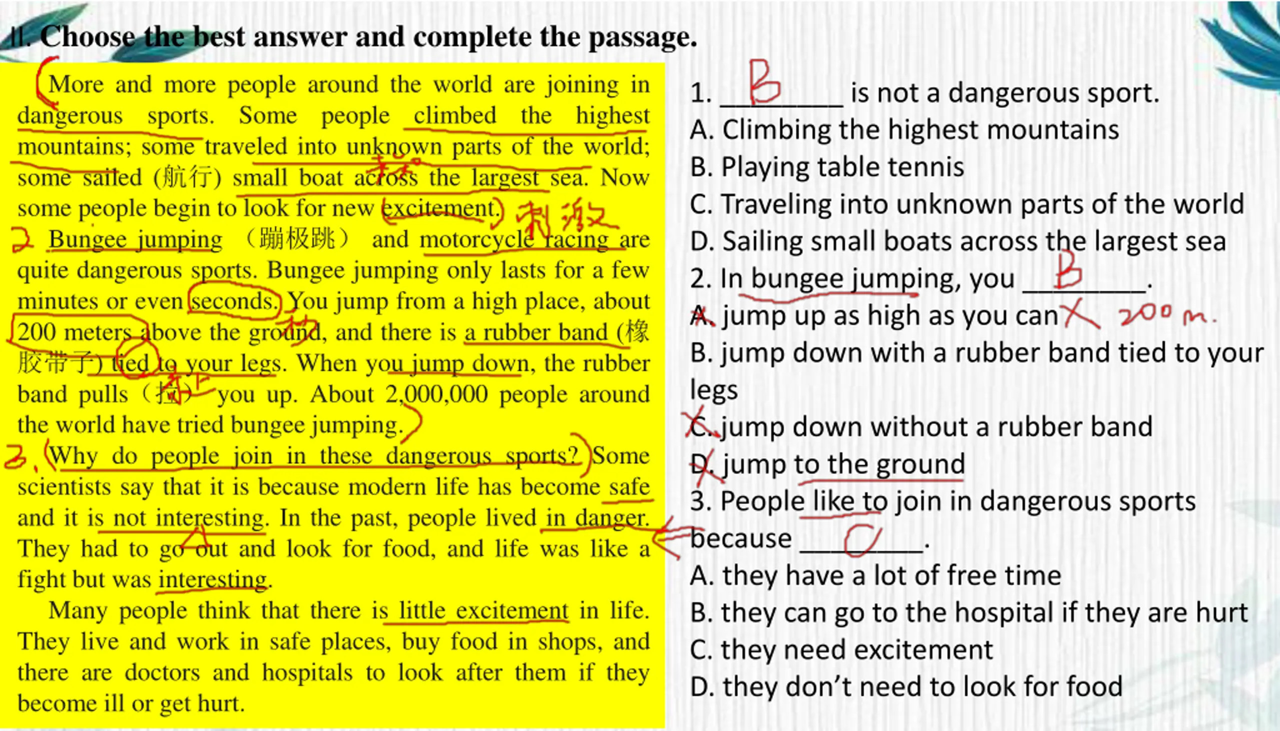 II. Choose the best answer and complete the passage. More and more people around the world are joining in dangerous sports. Some people mountains; some traveled into unknown parts of the world; some sailed ( ) small boat across the largest sea. Now some people begin to look for new excitement. Bungee jumping and motorcycle racing are quite dangerous sports. Bungee jumping only lasts for a few minutes or even seconds. You jump from a high place, about 200 meters above the ground, and there is a rubber band ( ) tied to your legs. When you jump down, the rubber band pulls you up. About 2,000,000 people around the world have tried bungee jumping. Why do people join in these dangerous sports? Some scientists say that it is because modern life has become safe and it is not interesting. In the past, people lived in danger. They had to go out and look for food, and life was like a fight but was interesting. Many people think that there is little excitement in life. They live and work in safe places, buy food in shops, and there are doctors and hospitals to look after them if they become ill or get hurt. 1. ________ is not a dangerous sport. A. Climbing the highest mountains B. Playing table tennis C. Traveling into unknown parts of the world D. Sailing small boats across the largest sea 2. In bungee jumping, you ________. A. jump up as high as you can B. jump down with a rubber band tied to your legs C. jump down without a rubber band D. jump to the ground 3. People like to join in dangerous sports because ________. A. they have a lot of free time B. they can go to the hospital if they are hurt C. they need excitement D. they don t need to look for food climbed the highest