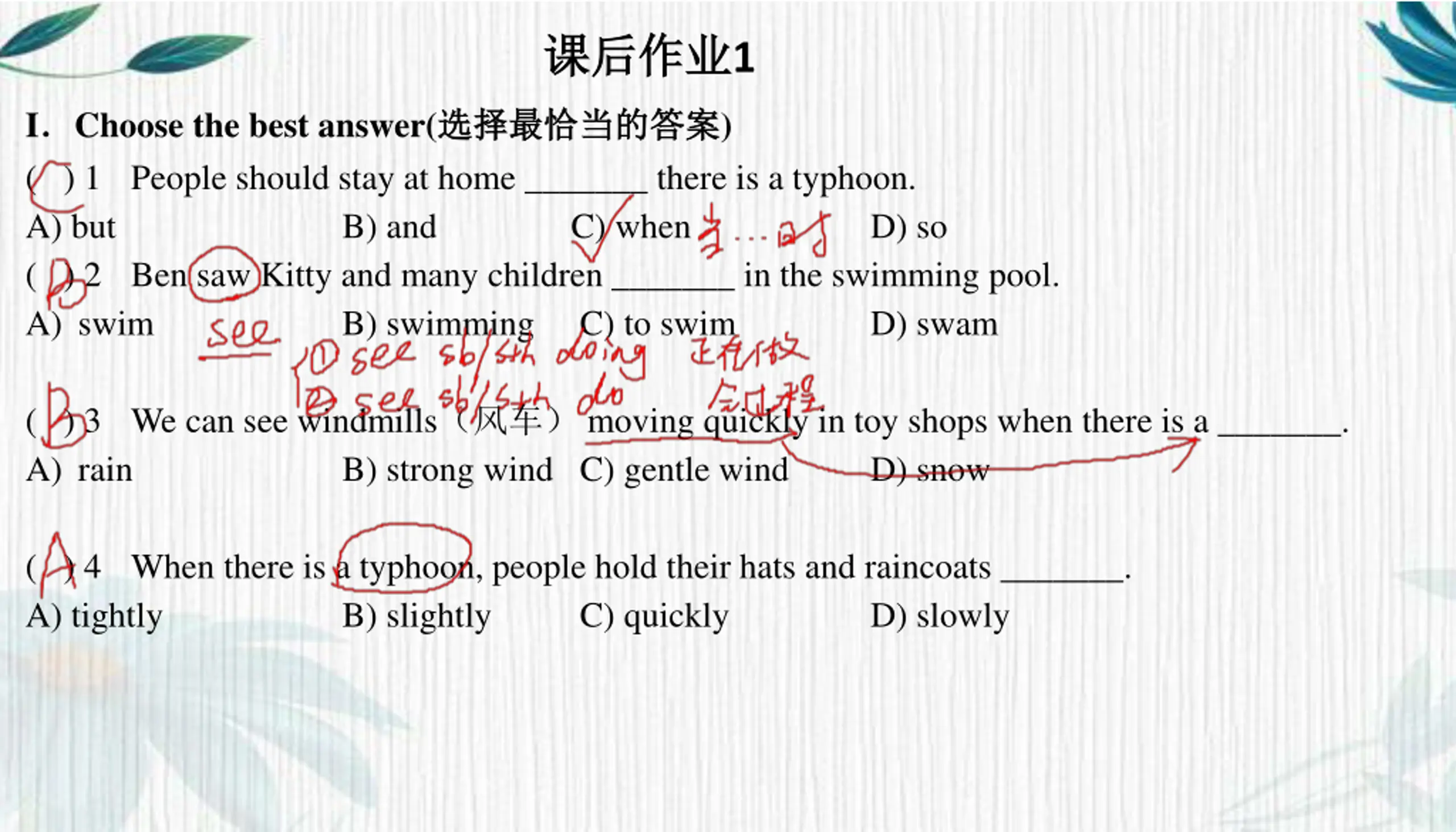 1 I Choose the best answer( ( ) 1 People should stay at home _______ there is a typhoon. A) but B) and ( ) 2 Ben saw Kitty and many children _______ in the swimming pool. A) swim B) swimming ) C) when D) so C) to swim D) swam ( ) 3 We can see windmills moving quickly in toy shops when there is a _______. A) rain B) strong wind C) gentle wind D) snow ( ) 4 When there is a typhoon, people hold their hats and raincoats _______. A) tightly B) slightly C) quickly D) slowly