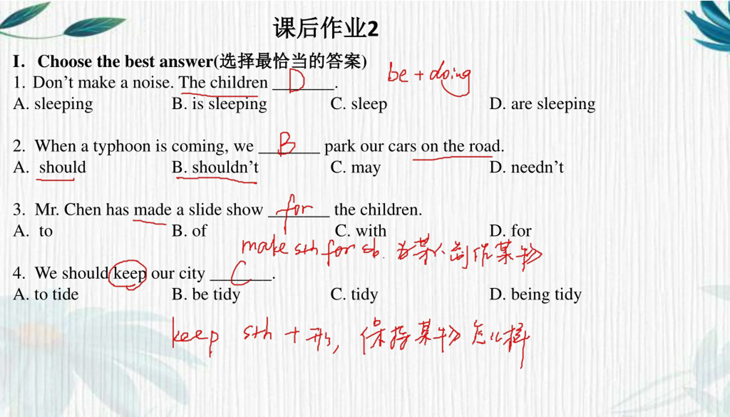 2 I Choose the best answer( 1. Don t make a noise. The children _______. A. sleeping B. is sleeping ) C. sleep D. are sleeping 2. When a typhoon is coming, we _______ park our cars on the road. A. should B. shouldn t C. may D. needn t 3. Mr. Chen has made a slide show _______ the children. A. to B. of C. with D. for 4. We should keep our city _______. A. to tide B. be tidy C. tidy D. being tidy