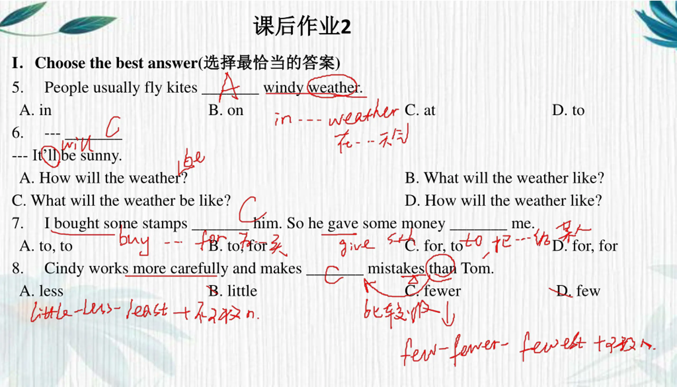 2 I Choose the best answer( 5. People usually fly kites _______ windy weather. A. in 6. --- _______ --- It ll be sunny. A. How will the weather? C. What will the weather be like? 7. I bought some stamps _______ him. So he gave some money _______ me. A. to, to B. to, for 8. Cindy works more carefully and makes _______ mistakes than Tom. A. less B. little ) B. on C. at D. to B. What will the weather like? D. How will the weather like? C. for, to D. for, for C. fewer D. few