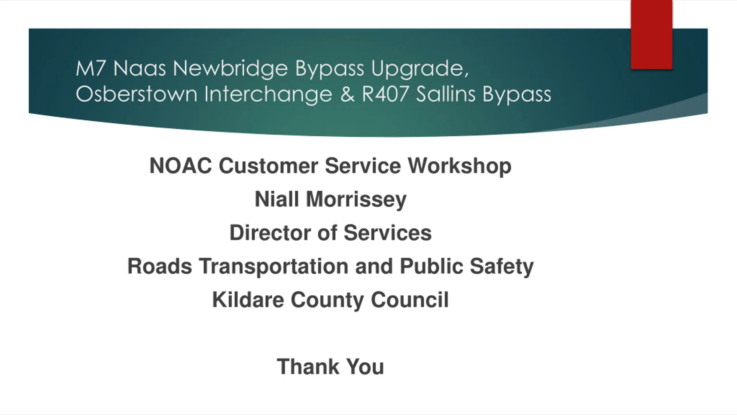 M7 Naas Newbridge Bypass Upgrade, Osberstown Interchange & R407 Sallins Bypass NOAC Customer Service Workshop Niall Morrissey Director of Services Roads Transportation and Public Safety Kildare County Council Thank You