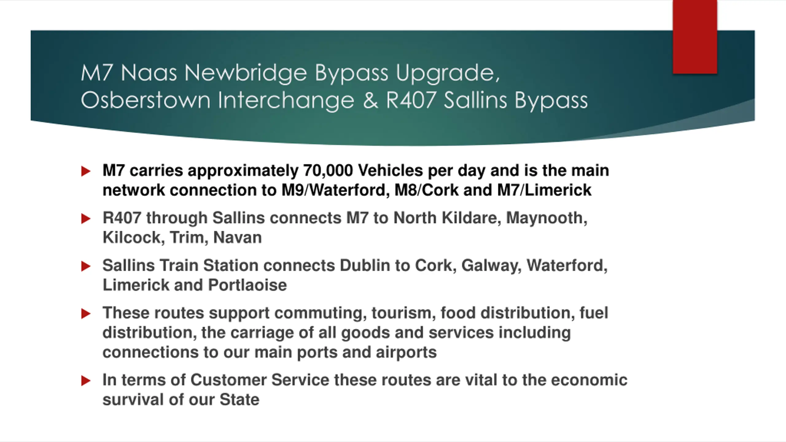 M7 Naas Newbridge Bypass Upgrade, Osberstown Interchange & R407 Sallins Bypass M7 carries approximately 70,000 Vehicles per day and is the main network connection to M9/Waterford, M8/Cork and M7/Limerick R407 through Sallins connects M7 to North Kildare, Maynooth, Kilcock, Trim, Navan Sallins Train Station connects Dublin to Cork, Galway, Waterford, Limerick and Portlaoise These routes support commuting, tourism, food distribution, fuel distribution, the carriage of all goods and services including connections to our main ports and airports In terms of Customer Service these routes are vital to the economic survival of our State