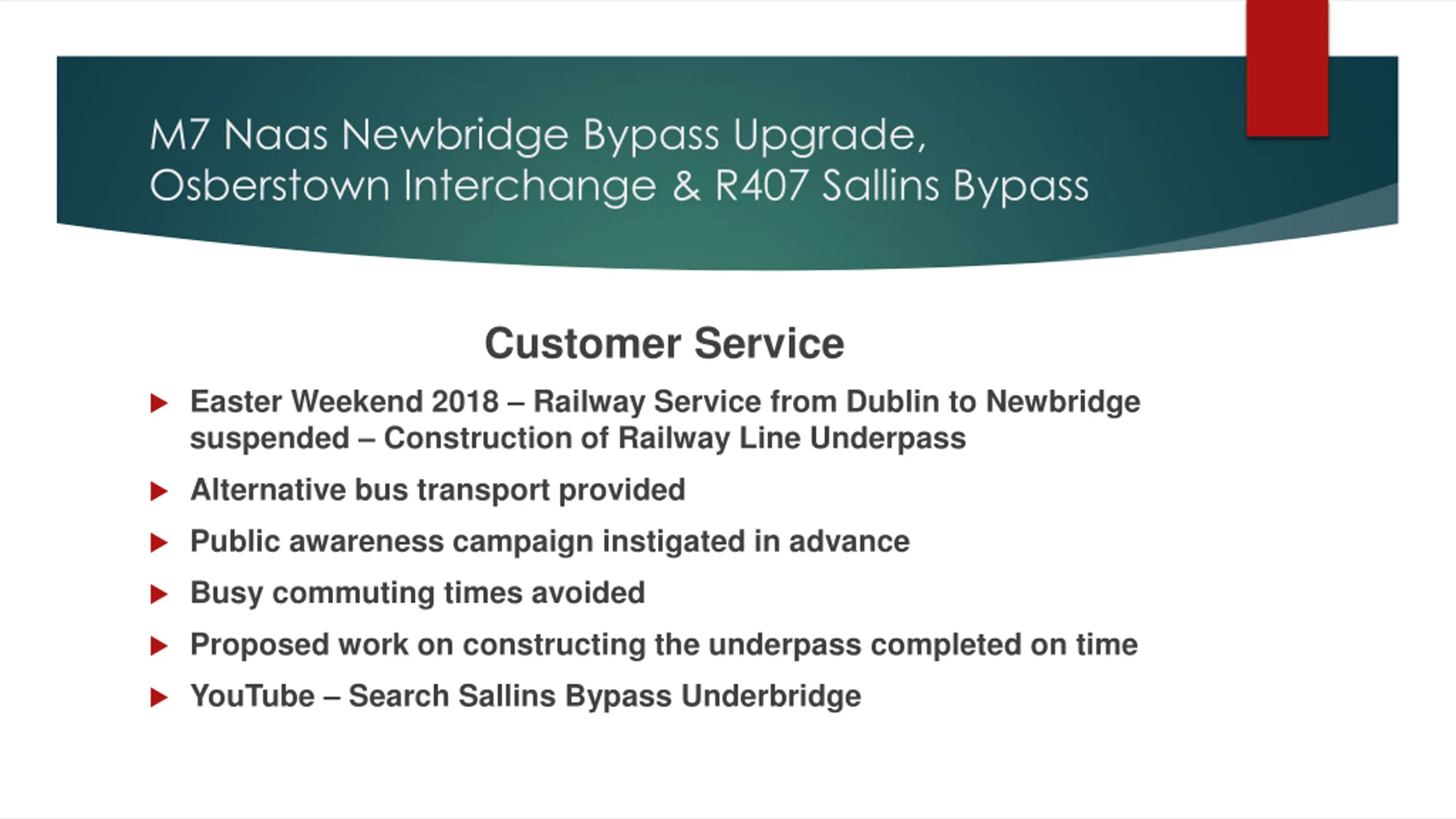 M7 Naas Newbridge Bypass Upgrade, Osberstown Interchange & R407 Sallins Bypass Customer Service Easter Weekend 2018 Railway Service from Dublin to Newbridge suspended Construction of Railway Line Underpass Alternative bus transport provided Public awareness campaign instigated in advance Busy commuting times avoided Proposed work on constructing the underpass completed on time YouTube Search Sallins Bypass Underbridge