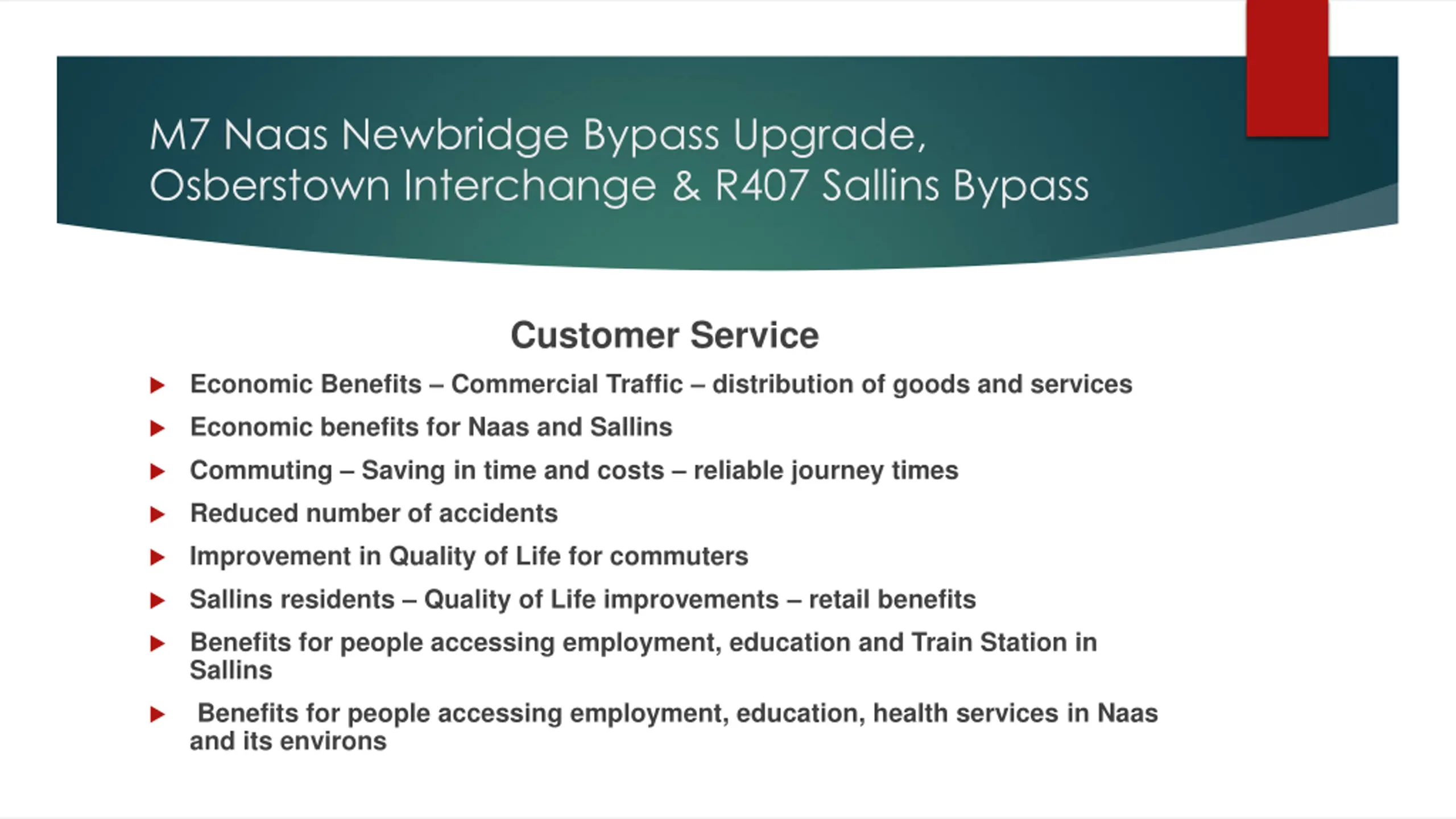 M7 Naas Newbridge Bypass Upgrade, Osberstown Interchange & R407 Sallins Bypass Customer Service Economic Benefits Commercial Traffic distribution of goods and services Economic benefits for Naas and Sallins Commuting Saving in time and costs reliable journey times Reduced number of accidents Improvement in Quality of Life for commuters Sallins residents Quality of Life improvements retail benefits Benefits for people accessing employment, education and Train Station in Sallins Benefits for people accessing employment, education, health services in Naas and its environs