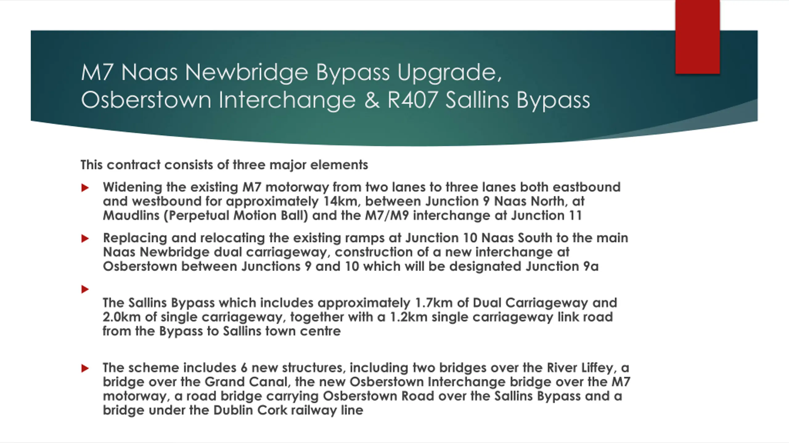 M7 Naas Newbridge Bypass Upgrade, Osberstown Interchange & R407 Sallins Bypass This contract consists of three major elements Widening the existing M7 motorway from two lanes to three lanes both eastbound and westbound for approximately 14km, between Junction 9 Naas North, at Maudlins (Perpetual Motion Ball) and the M7/M9 interchange at Junction 11 Replacing and relocating the existing ramps at Junction 10 Naas South to the main Naas Newbridge dual carriageway, construction of a new interchange at Osberstown between Junctions 9 and 10 which will be designated Junction 9a The Sallins Bypass which includes approximately 1.7km of Dual Carriageway and 2.0km of single carriageway, together with a 1.2km single carriageway link road from the Bypass to Sallins town centre The scheme includes 6 new structures, including two bridges over the River Liffey, a bridge over the Grand Canal, the new Osberstown Interchange bridge over the M7 motorway, a road bridge carrying Osberstown Road over the Sallins Bypass and a bridge under the Dublin Cork railway line