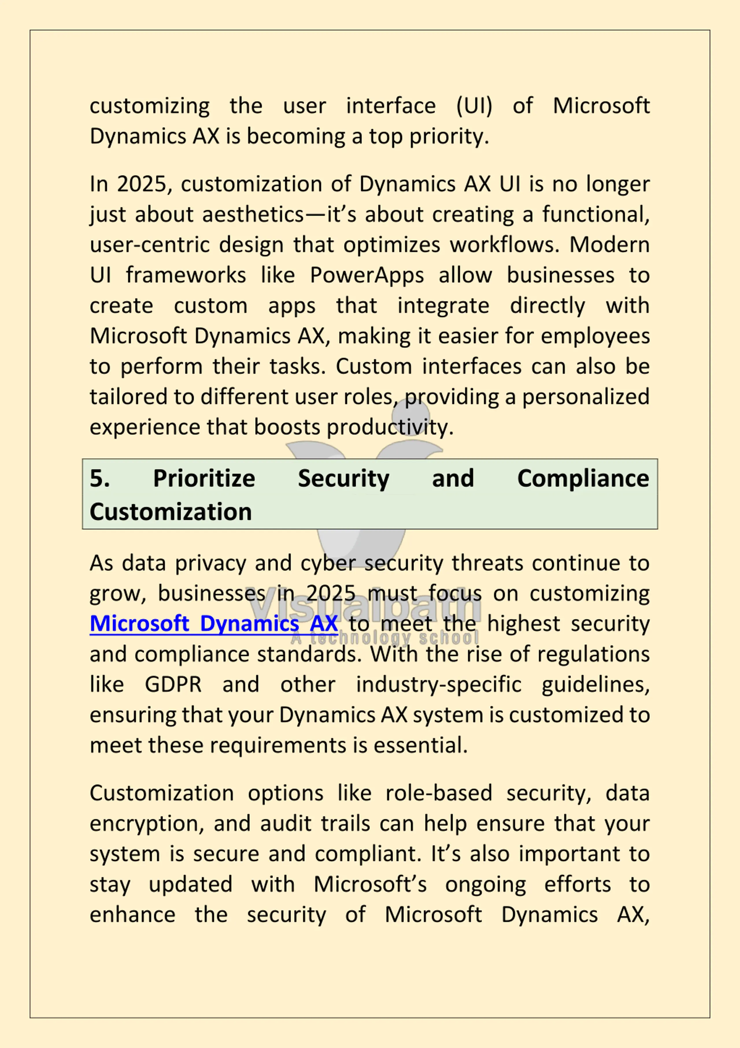 customizing the user interface (UI) of Microsoft Dynamics AX is becoming a top priority. In 2025, customization of Dynamics AX UI is no longer just about aesthetics it s about creating a functional, user-centric design that optimizes workflows. Modern UI frameworks like PowerApps allow businesses to create custom apps that integrate directly with Microsoft Dynamics AX, making it easier for employees to perform their tasks. Custom interfaces can also be tailored to different user roles, providing a personalized experience that boosts productivity. 5. Customization Prioritize Security and Compliance As data privacy and cyber security threats continue to grow, businesses in 2025 must focus on customizing Microsoft Dynamics AX to meet the highest security and compliance standards. With the rise of regulations like GDPR and other industry-specific guidelines, ensuring that your Dynamics AX system is customized to meet these requirements is essential. Customization options like role-based security, data encryption, and audit trails can help ensure that your system is secure and compliant. It s also important to stay updated with Microsoft s ongoing efforts to enhance the security of Microsoft Dynamics AX,