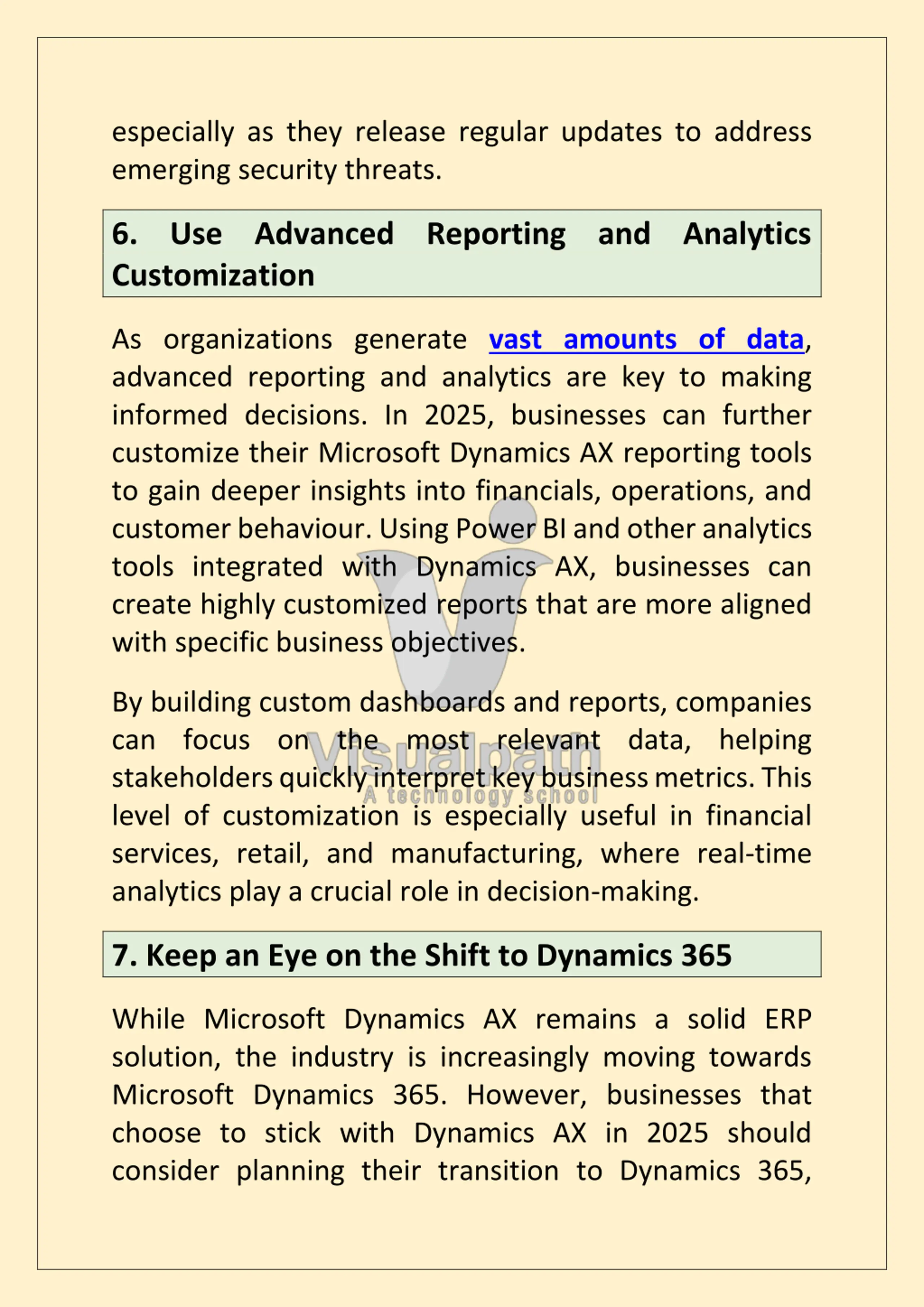 especially as they release regular updates to address emerging security threats. 6. Use Advanced Reporting and Analytics Customization As organizations generate vast amounts of data, advanced reporting and analytics are key to making informed decisions. In 2025, businesses can further customize their Microsoft Dynamics AX reporting tools to gain deeper insights into financials, operations, and customer behaviour. Using Power BI and other analytics tools integrated with Dynamics AX, businesses can create highly customized reports that are more aligned with specific business objectives. By building custom dashboards and reports, companies can focus on the most relevant data, helping stakeholders quickly interpret key business metrics. This level of customization is especially useful in financial services, retail, and manufacturing, where real-time analytics play a crucial role in decision-making. 7. Keep an Eye on the Shift to Dynamics 365 While Microsoft Dynamics AX remains a solid ERP solution, the industry is increasingly moving towards Microsoft Dynamics 365. However, businesses that choose to stick with Dynamics AX in 2025 should consider planning their transition to Dynamics 365,